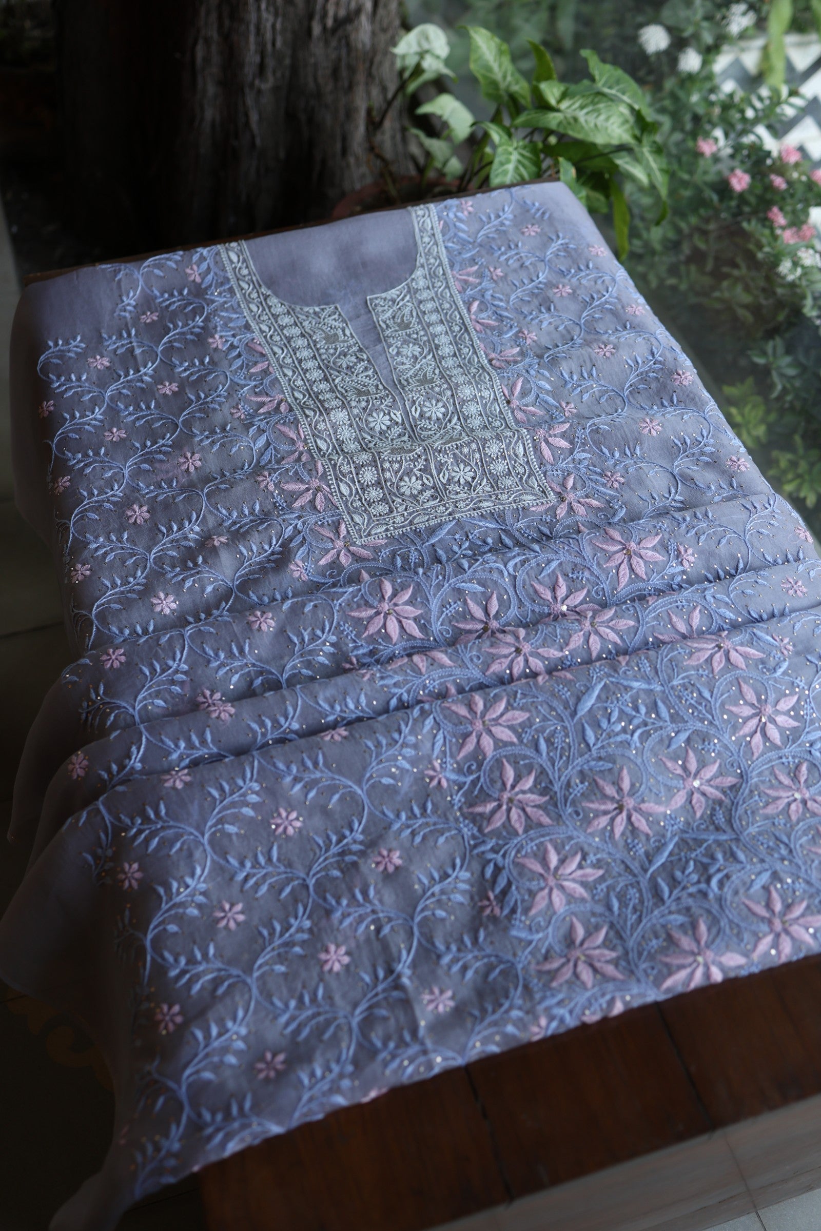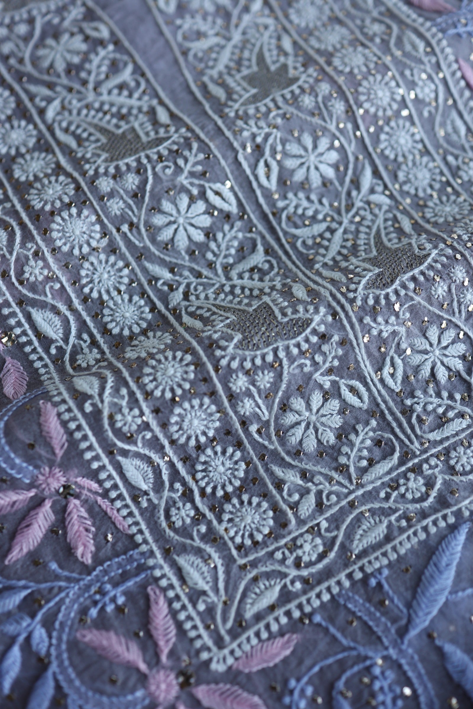 Slate Grey Shade Noor Organza Silk Chikankari With Kamdani Fabric