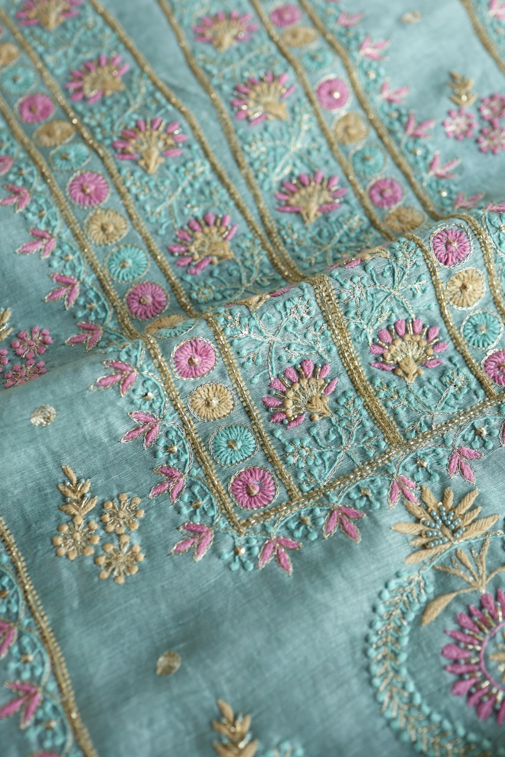 Soft Blue Silk Chikankari With Ari Work Unstitched Kurta Dupatta Set