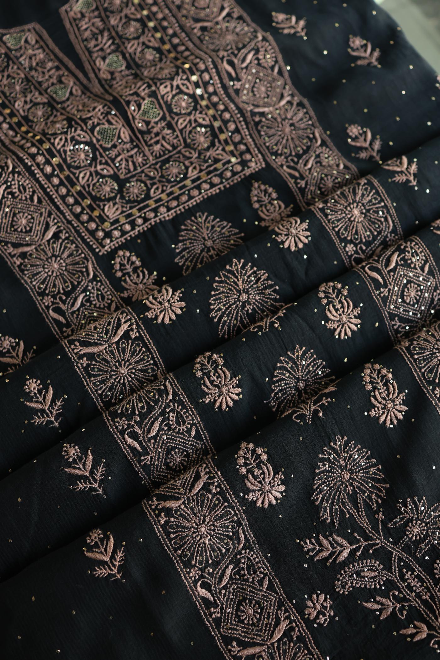Black Mal Cotton Fine Chikankari With Kamdani Work Unstitched Fabric
