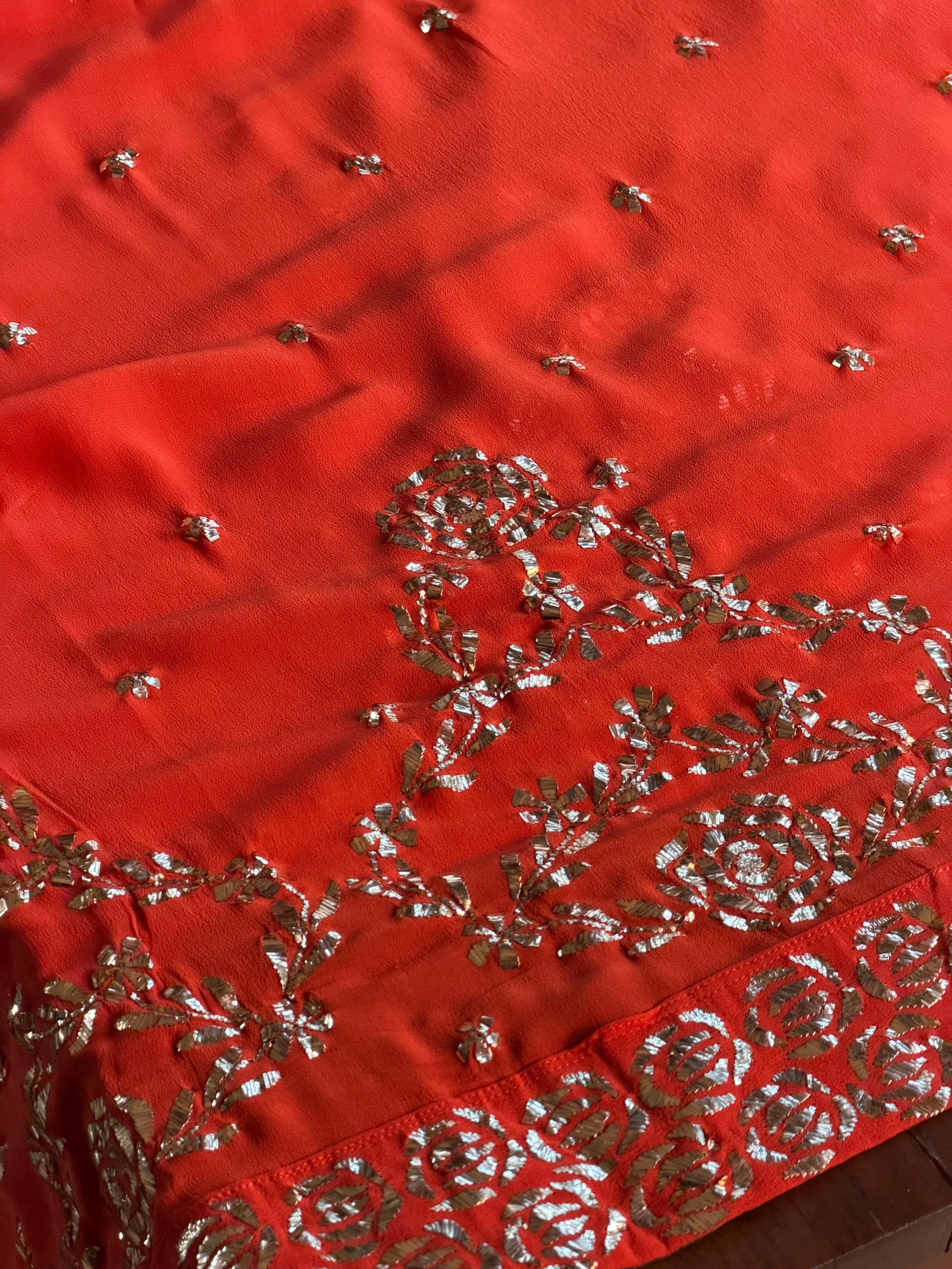 A stunning Orange heirloom jadau mukaish ensemble featuring traditional gharara-style pants paired with a sleek georgette kurta and a matching dupatta, all adorned with delicate mukaish accents for an elegant, timeless look.