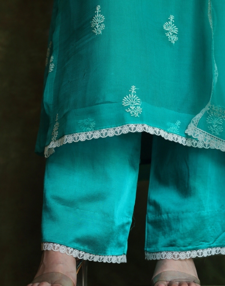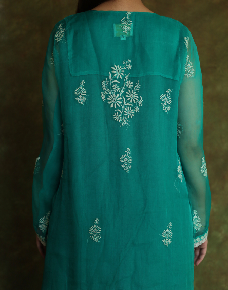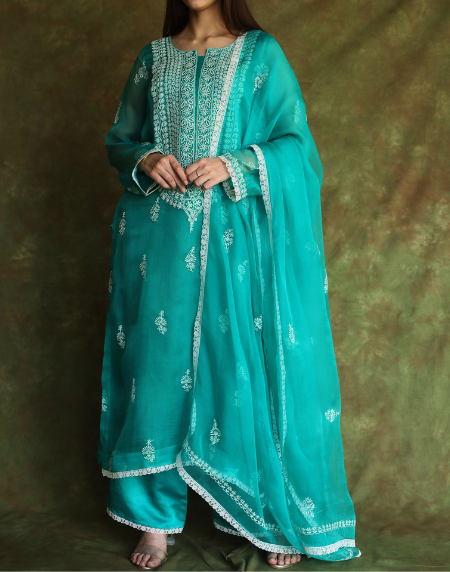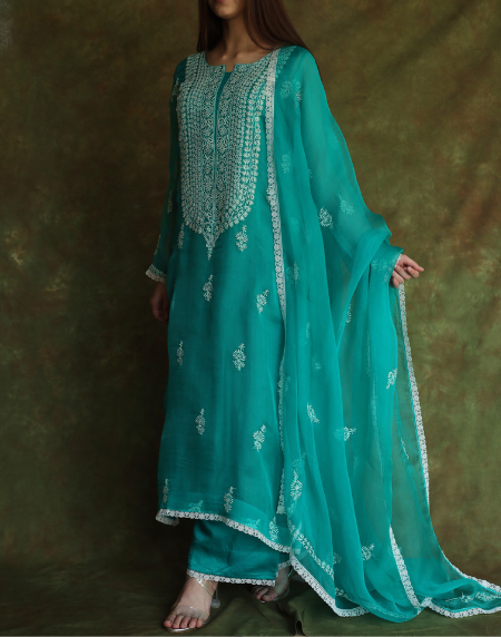 Teal Green Mukaish Kamdani Noor Organza Chikankari Kurta Set