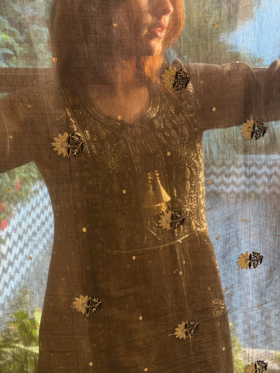Tissue silk with intricate Chikankari on mustard yellow shade finished and accessorised, with our signature ari/pitta work for upcoming festivities.