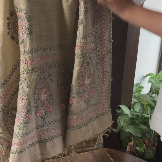 Fine Chikankari ari tissue silk dupatta done with multi coloured intricate embroidery & sequins work on natural shade finished with silk.