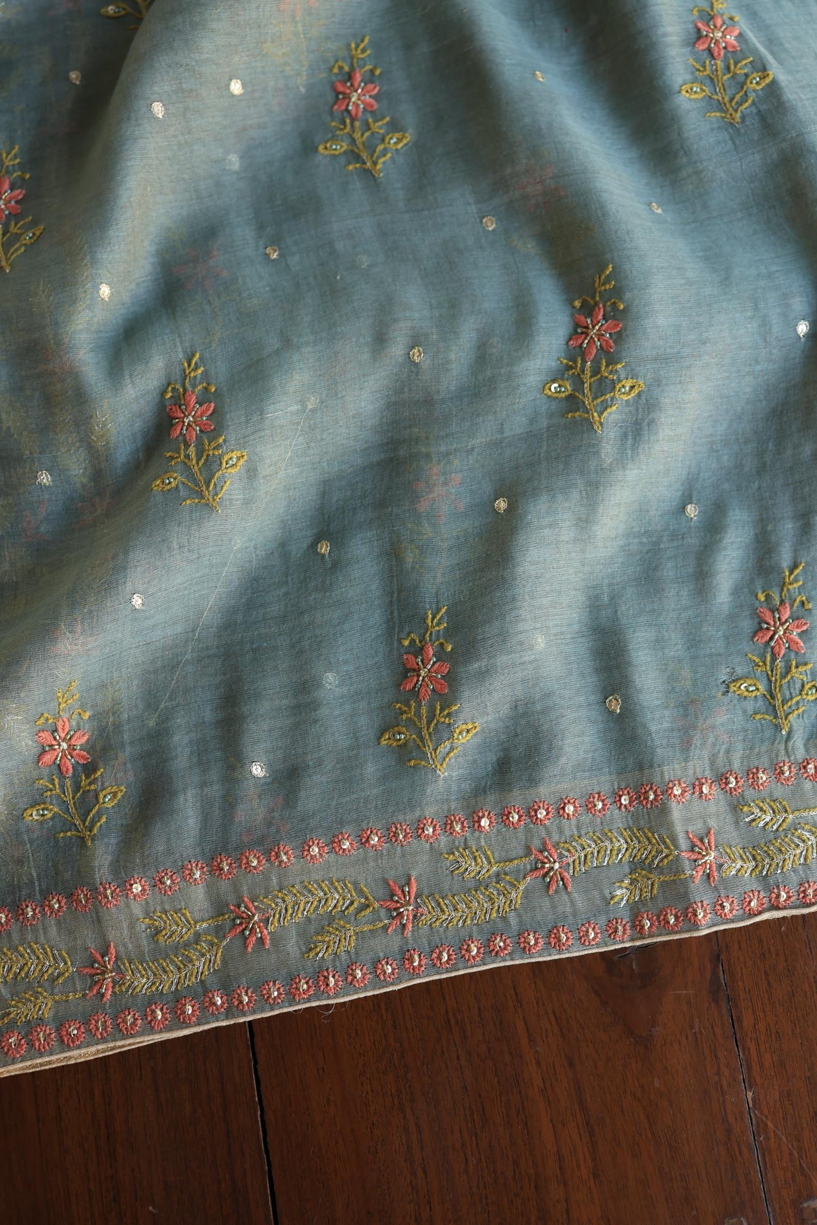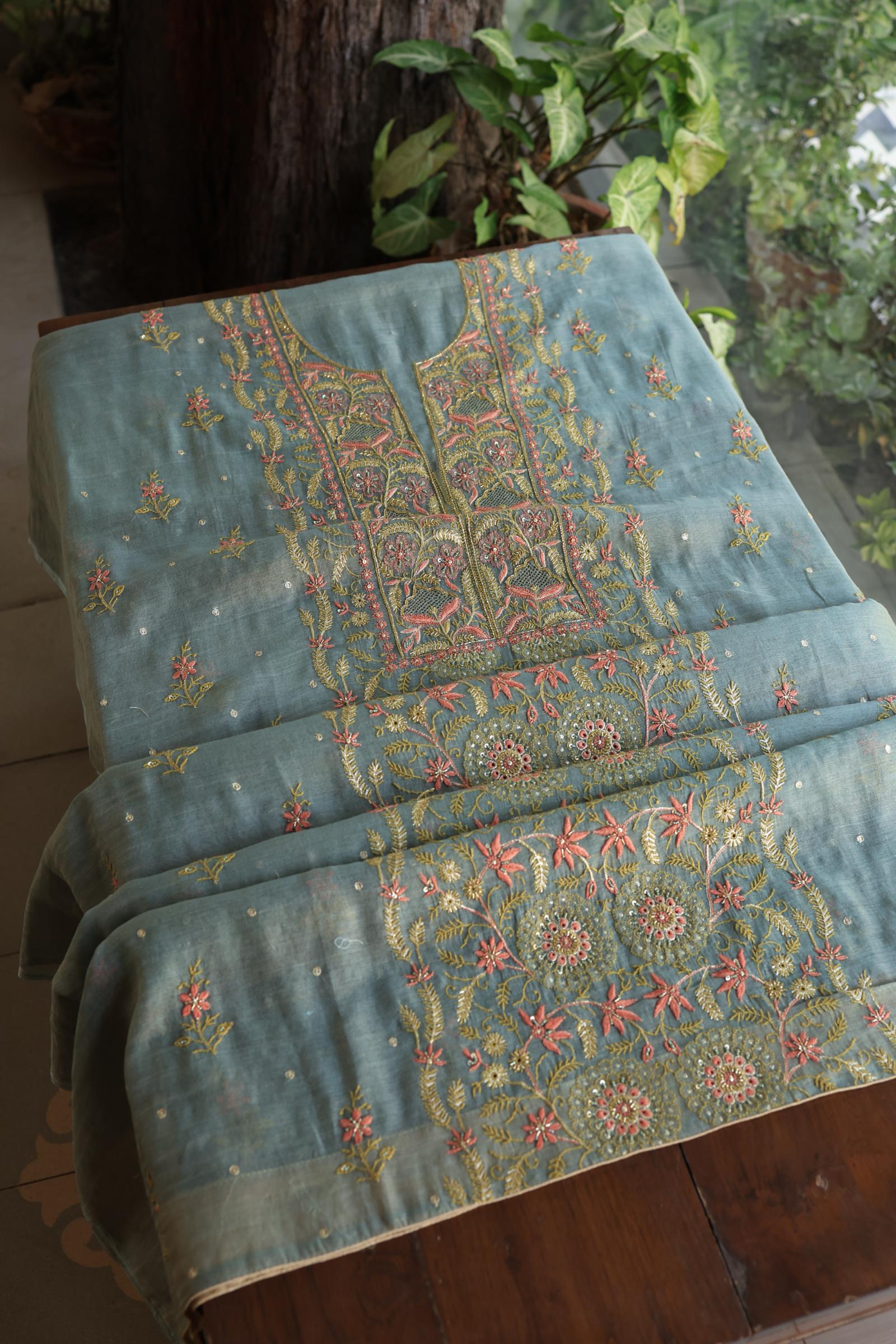 Turquoise Grey Shade Tissue Silk Chikankari Unstitched Fabric