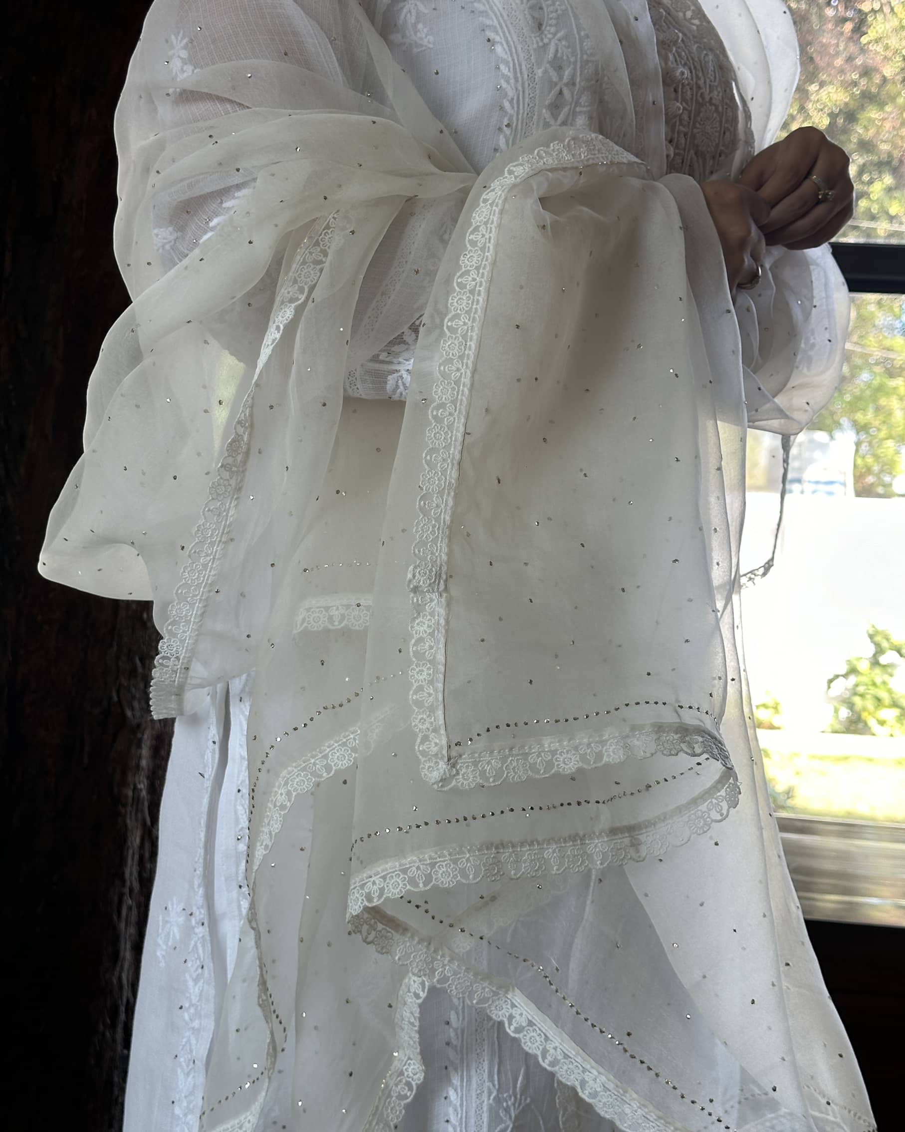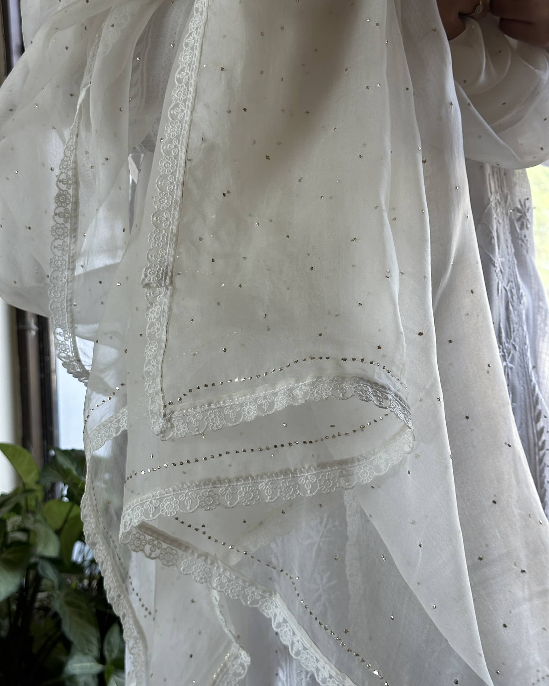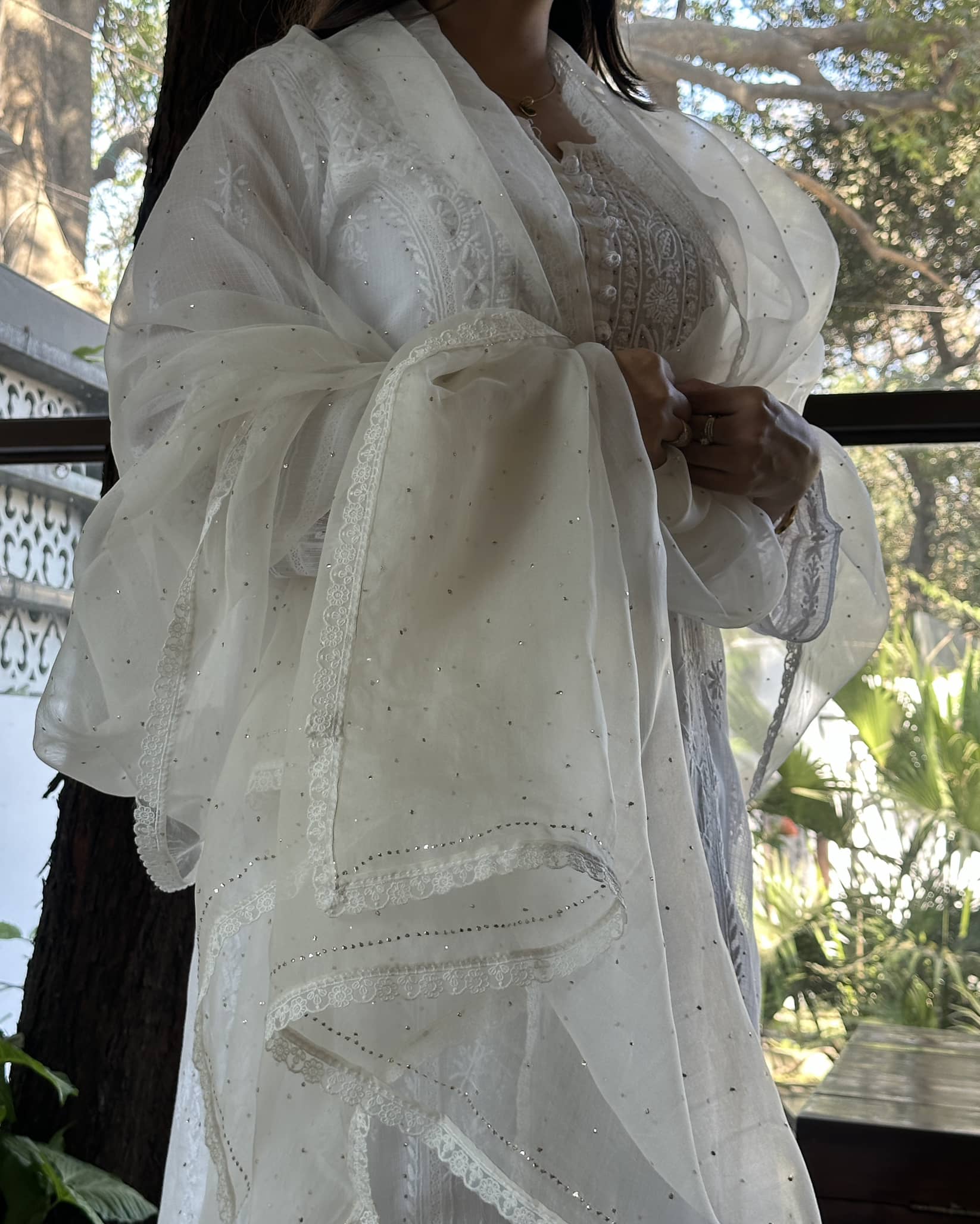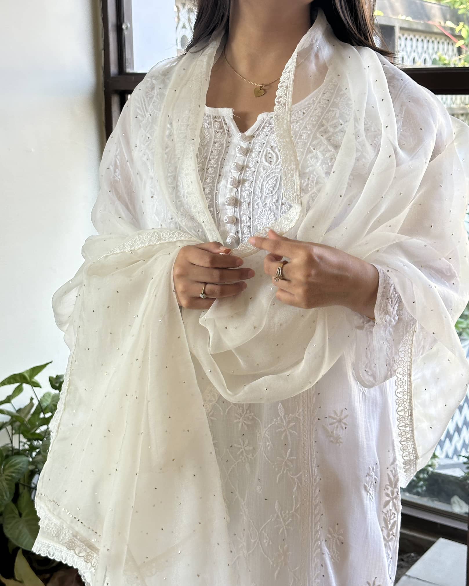 Each piece is crafted with intricate hand-embroidered Chikankari, featuring different traditional embellishments: