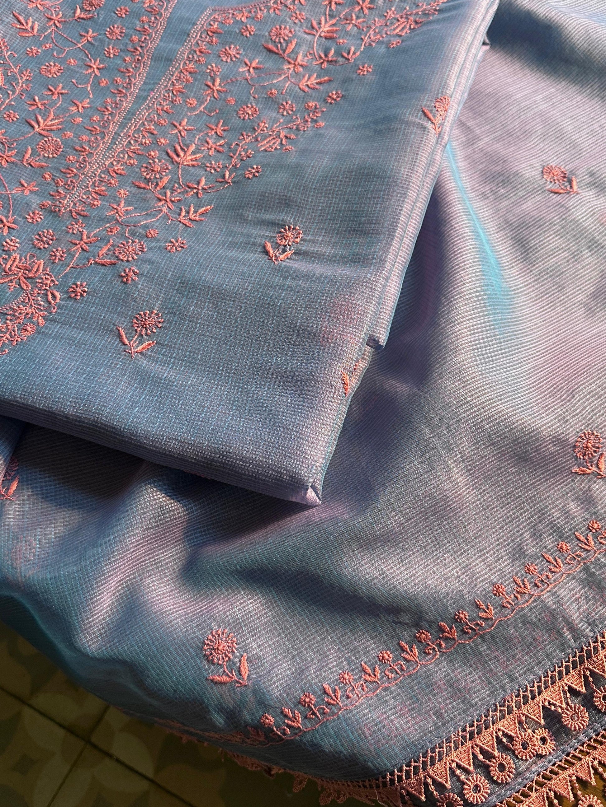 Blue & Pink Kota Chikankari Unstitched Fabric