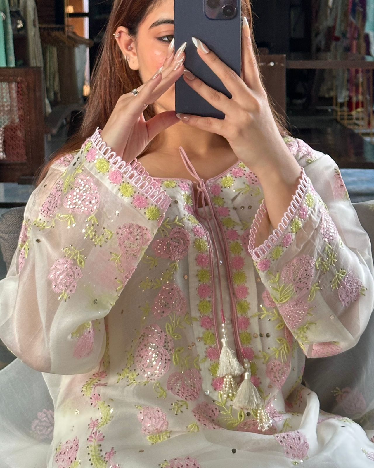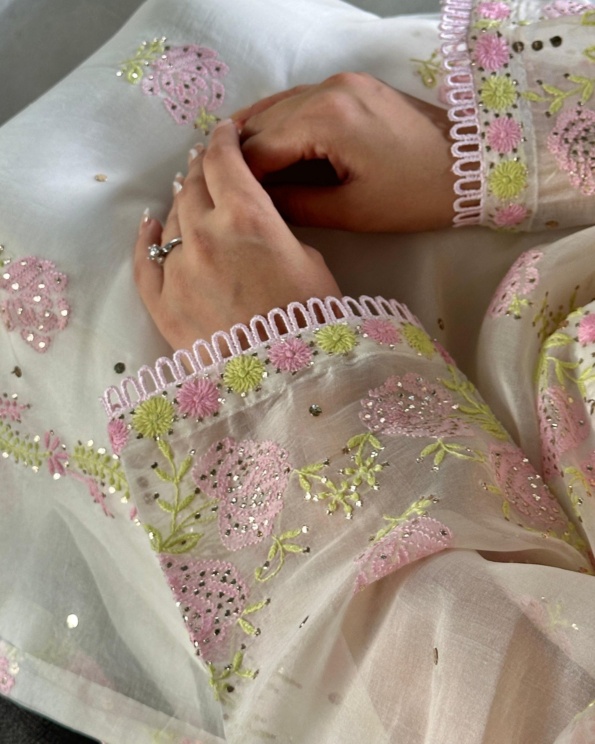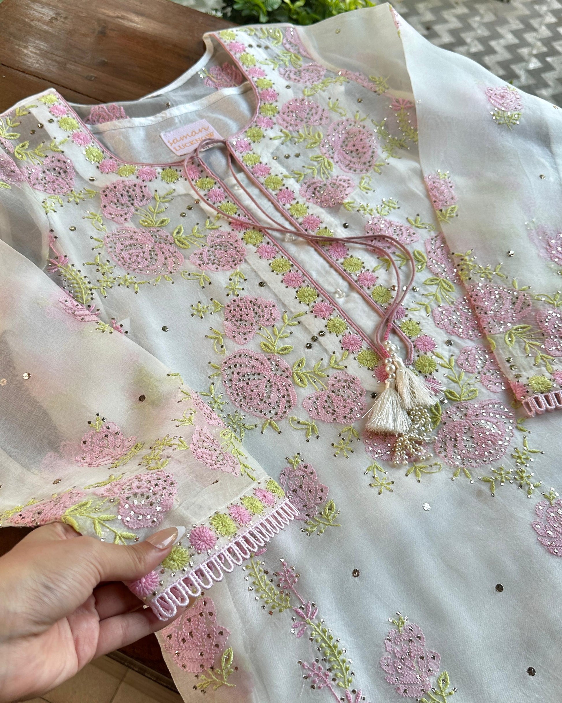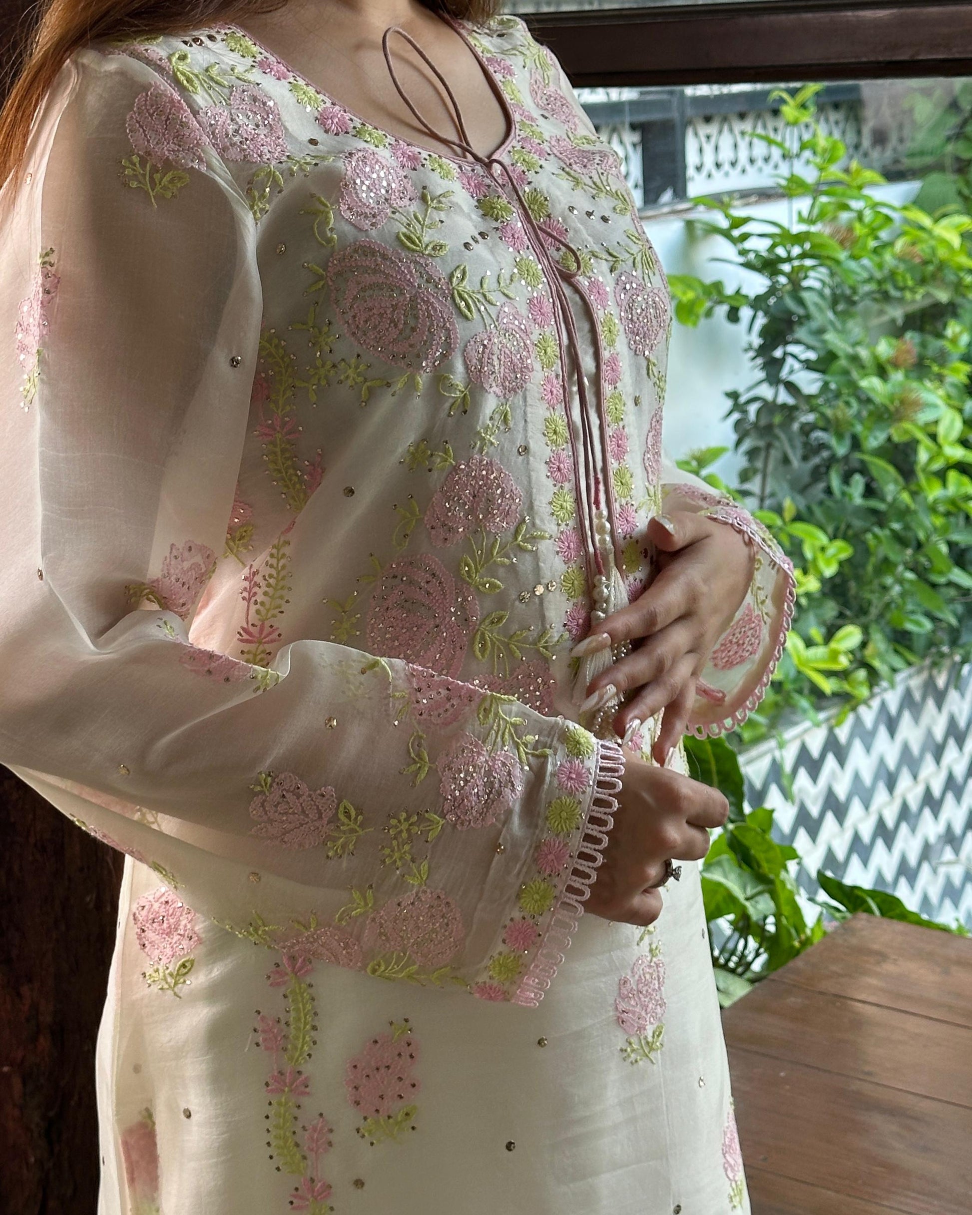Each piece is crafted with intricate hand-embroidered Chikankari, featuring different traditional embellishments: