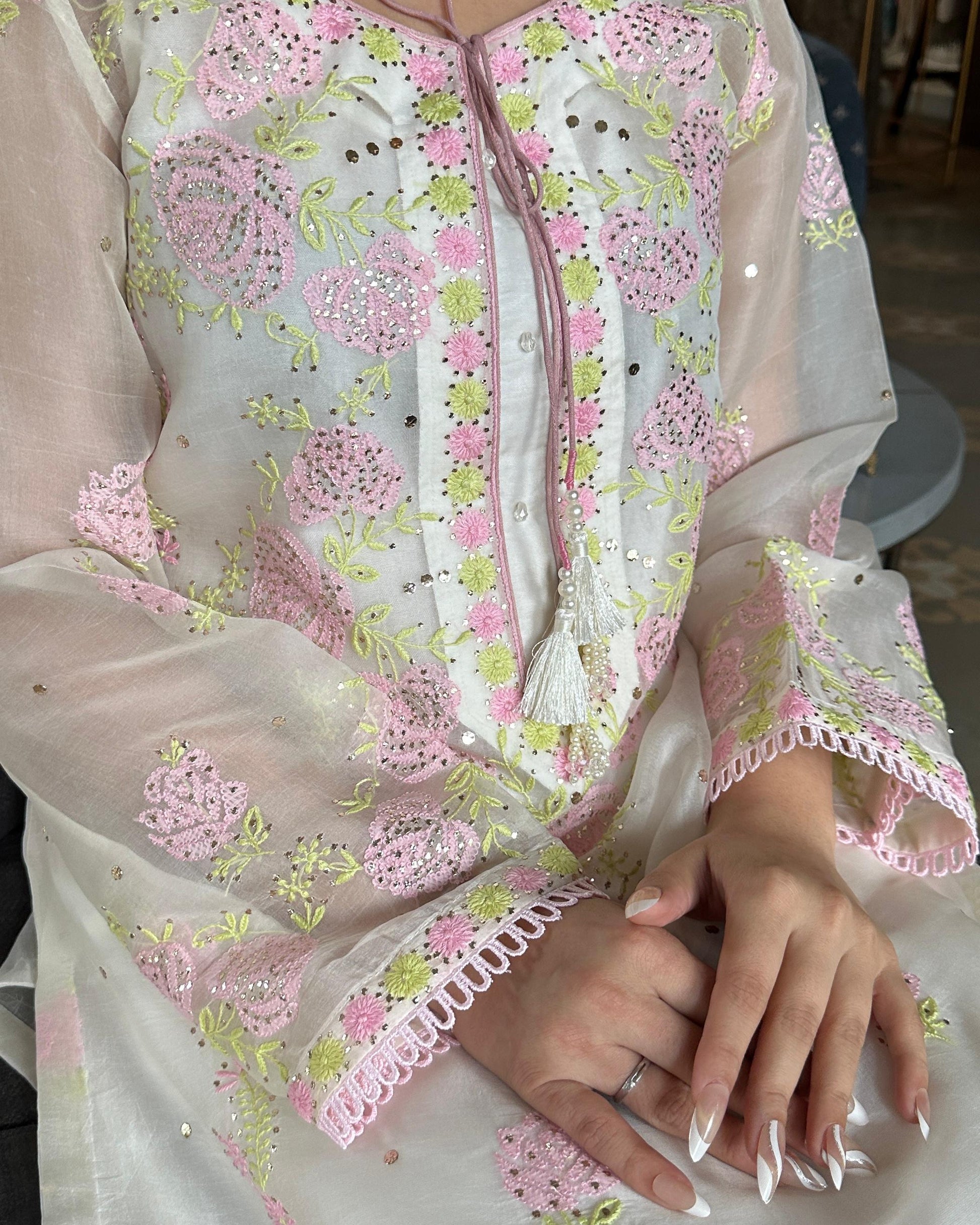 Elegant organza on Chikankari embroidery done with the combination of appliqué and white thread embroidery and our mukaish work clubbed with Organza done of classic white chikankari embroidery dupatta.