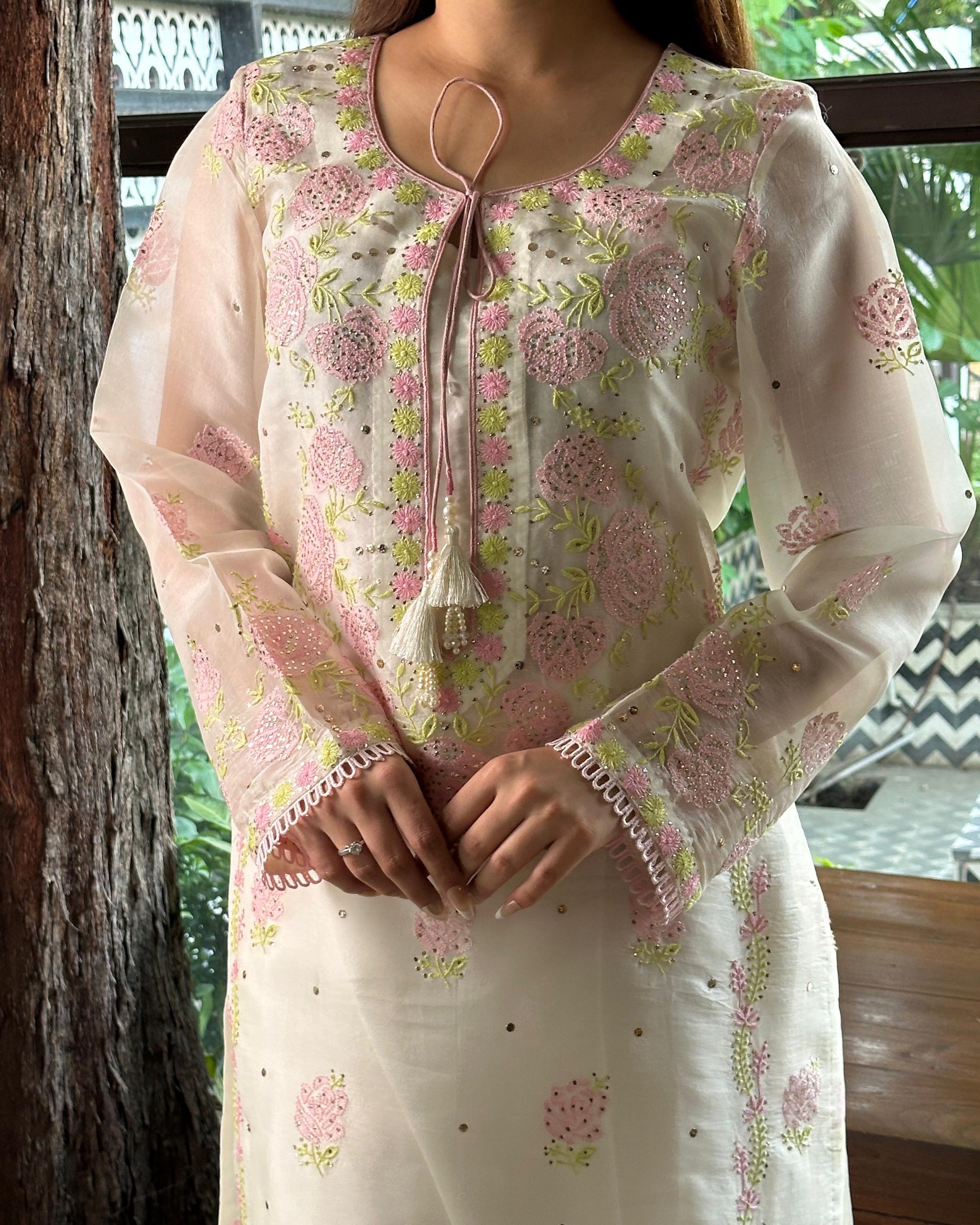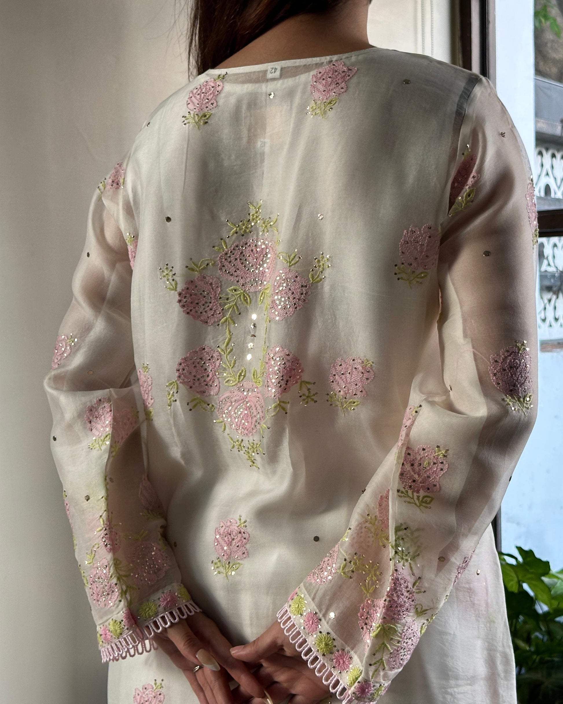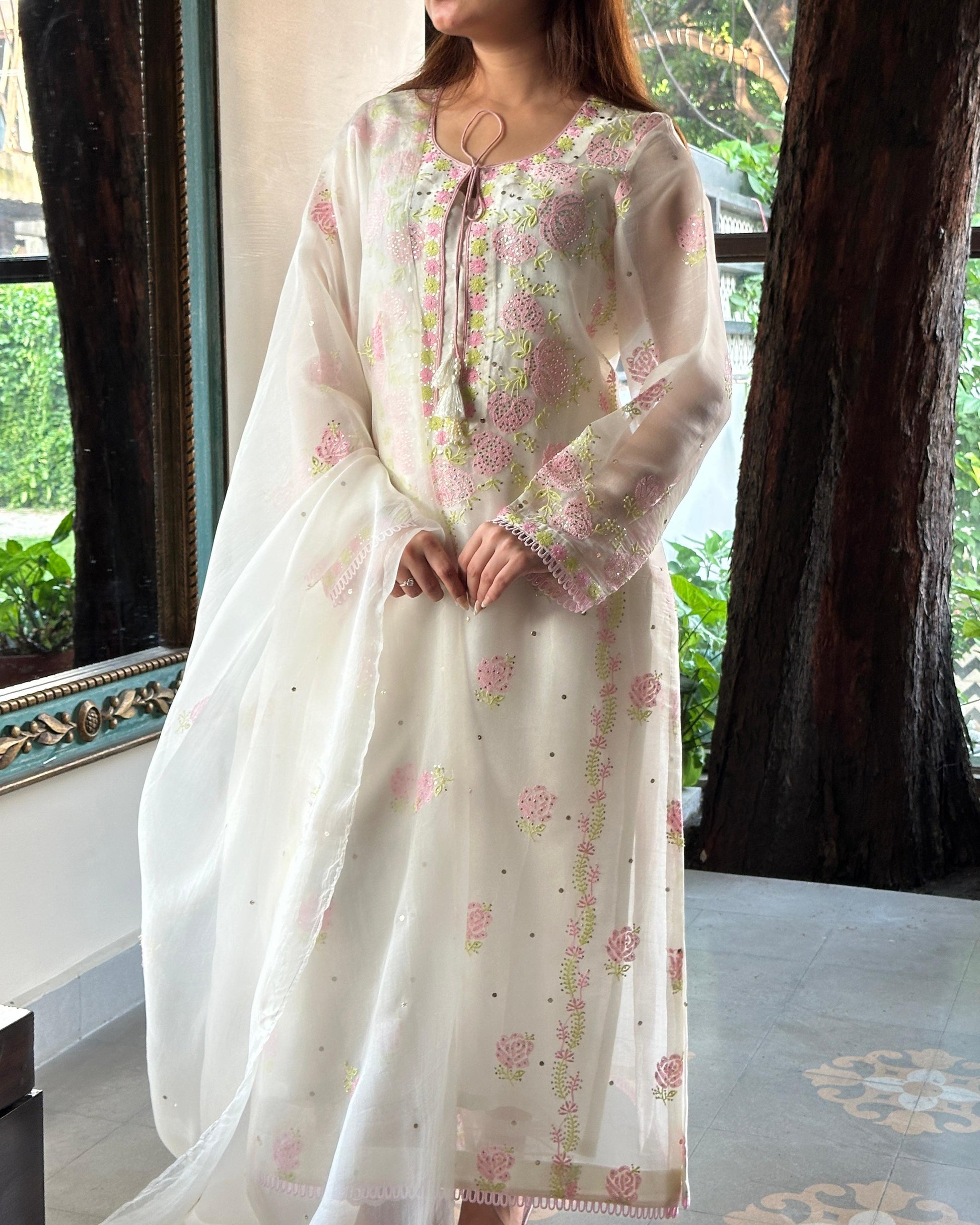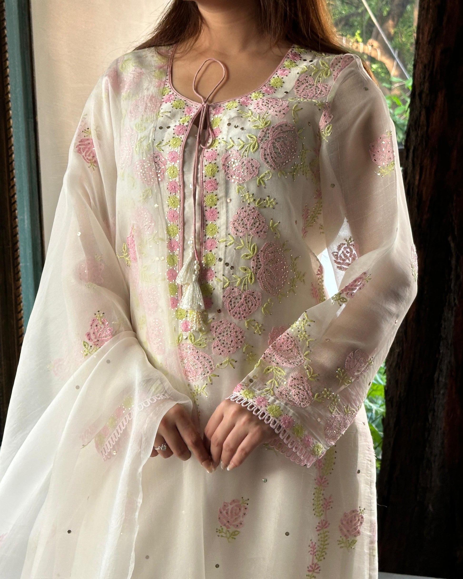 White Mukaish Kamdani Noor Organza Chikankari Kurta Set