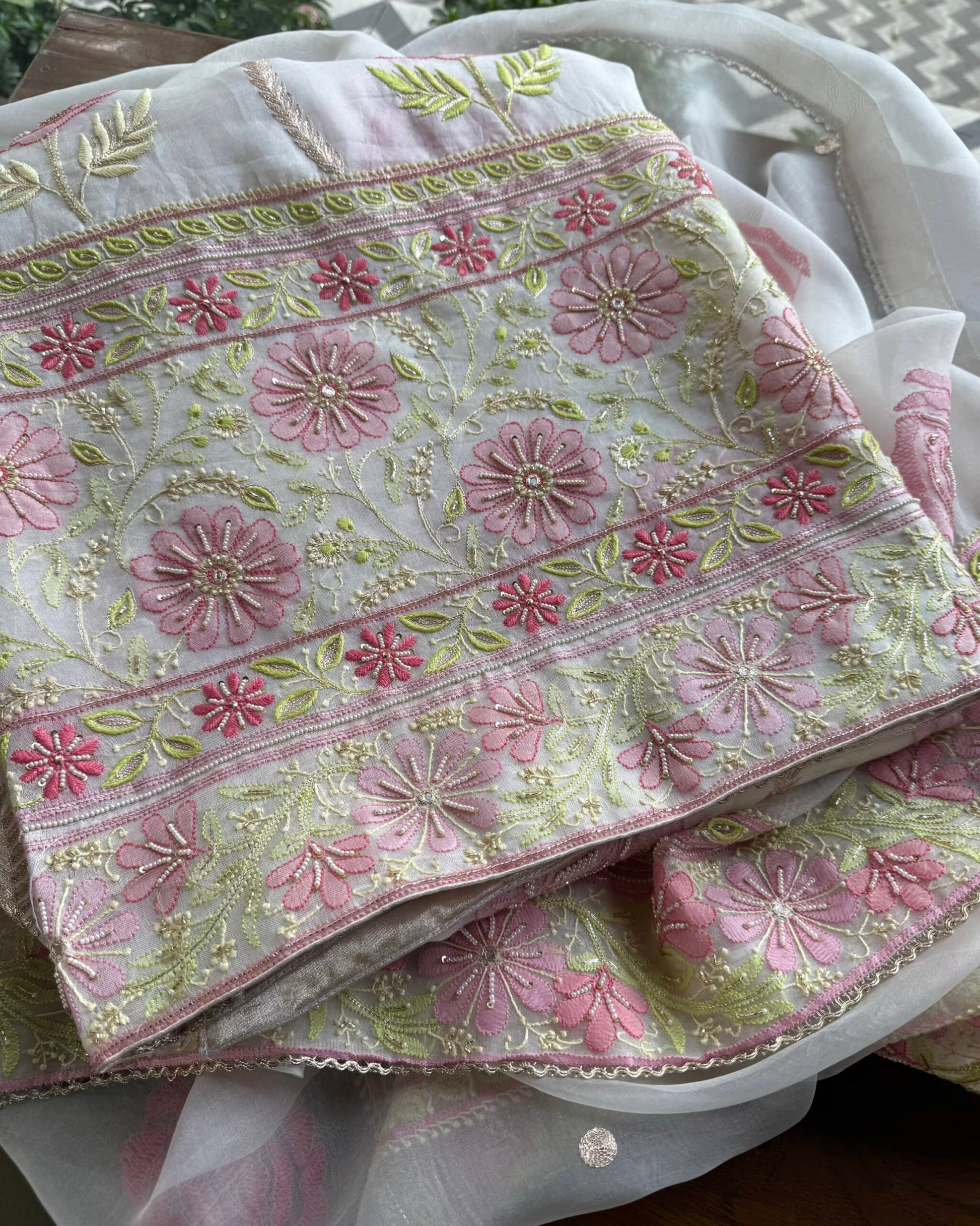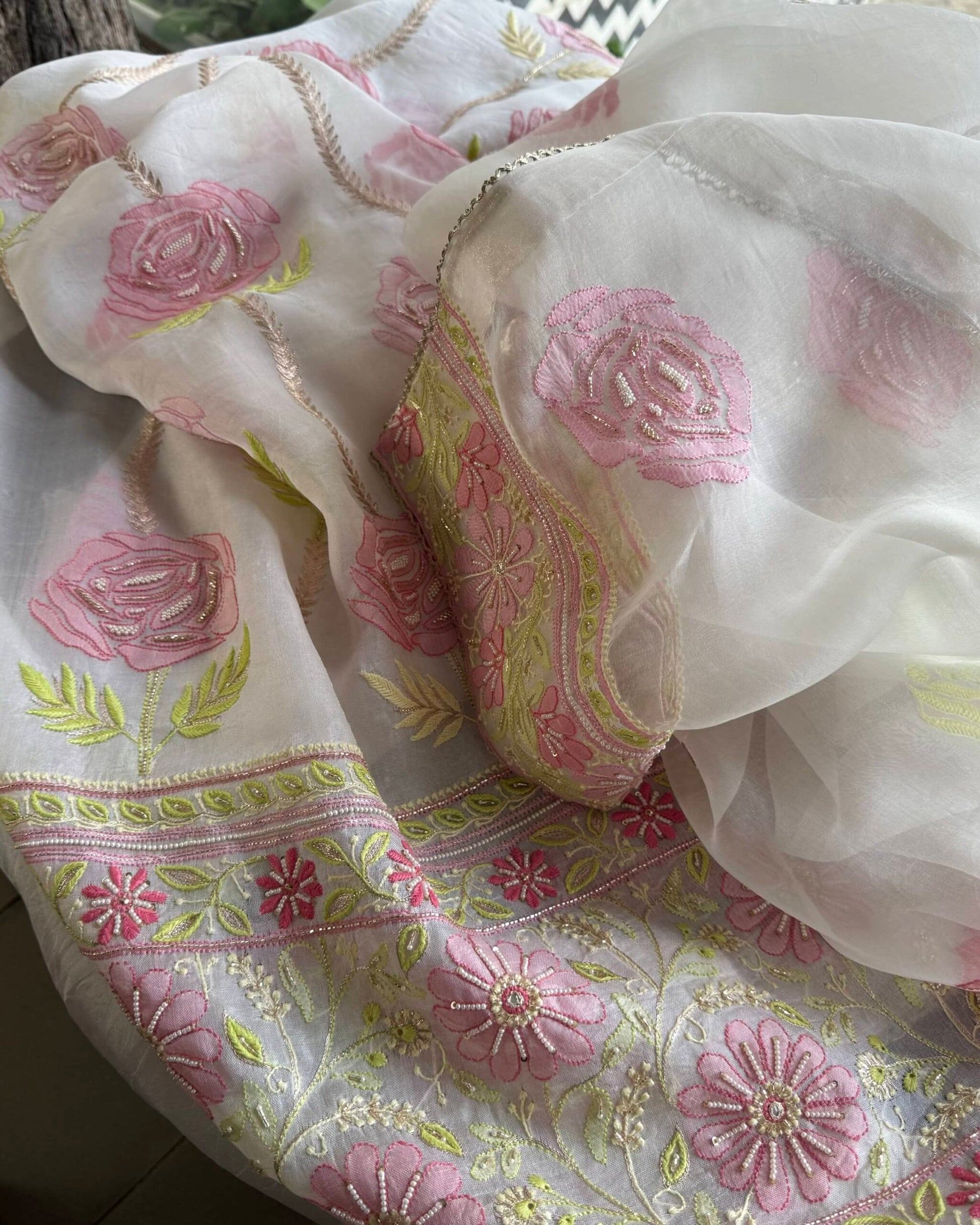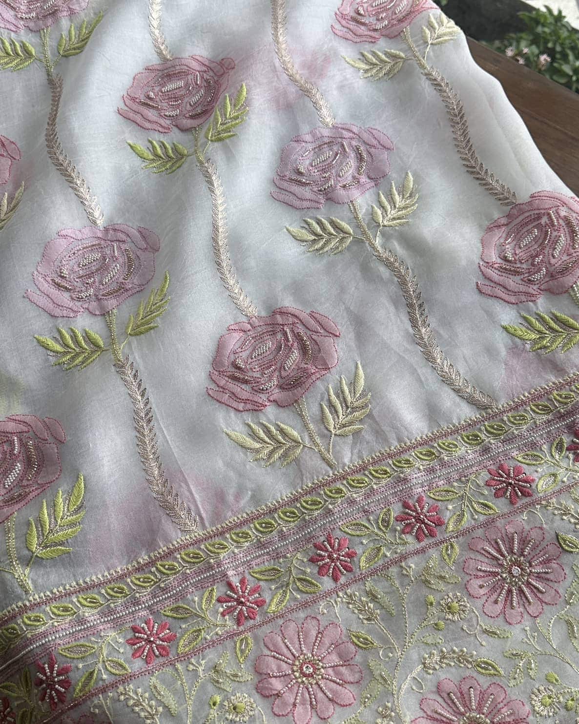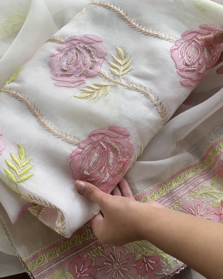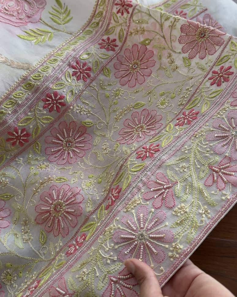 Organza's in our pastel shades are a dreamy affair done with intricate dual tone Chikankari embroideries and add on with our signature SAMAN's Ari and beads work.