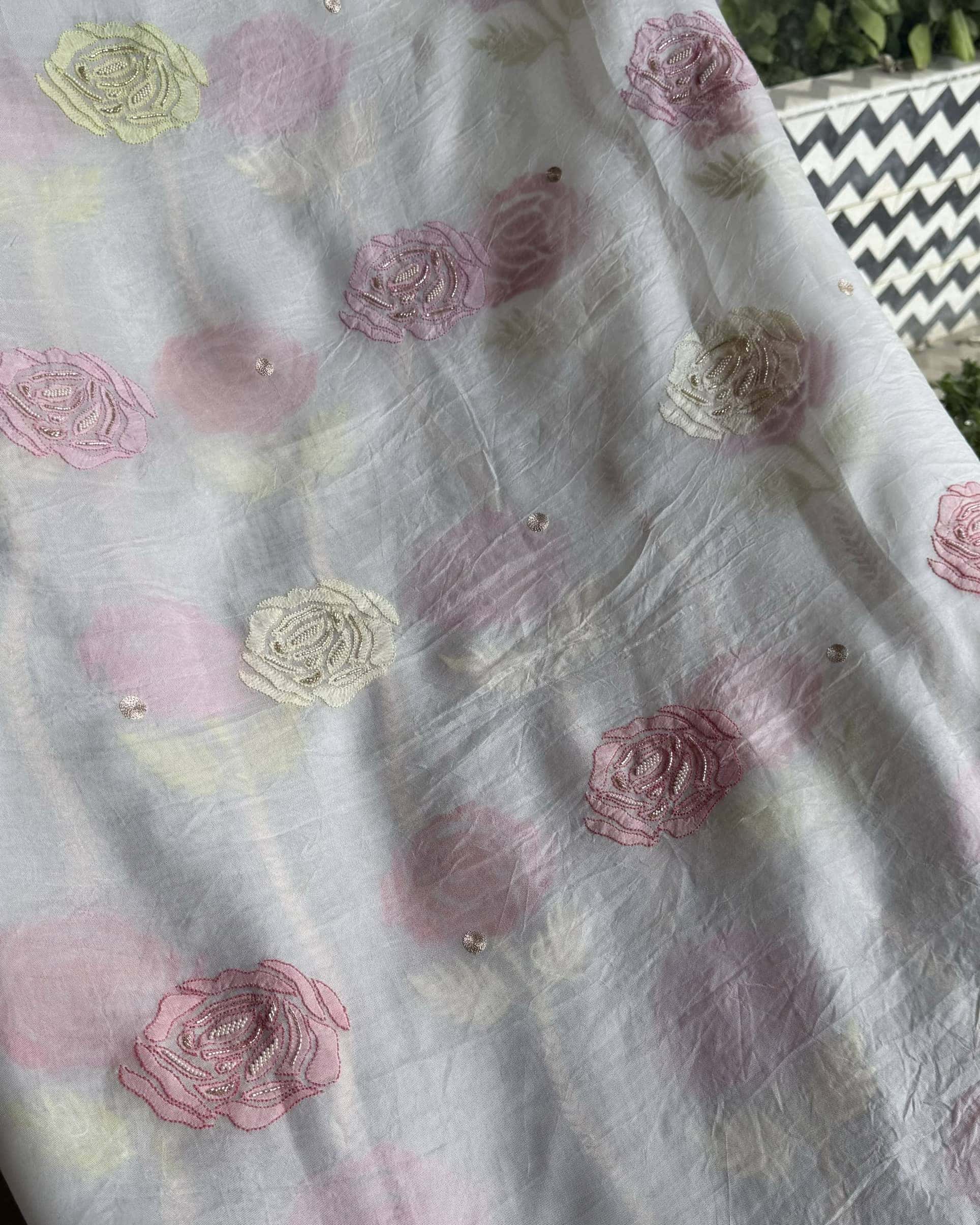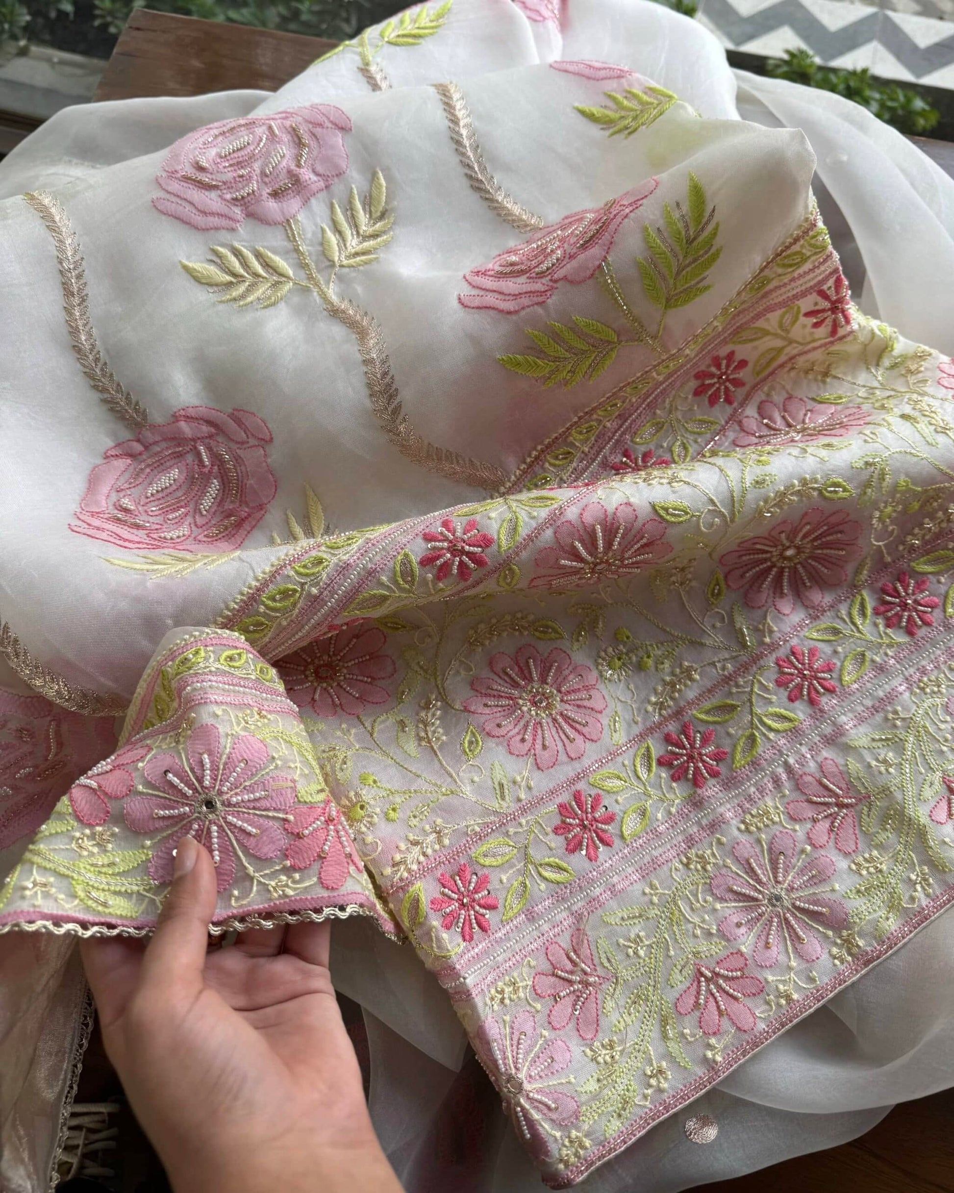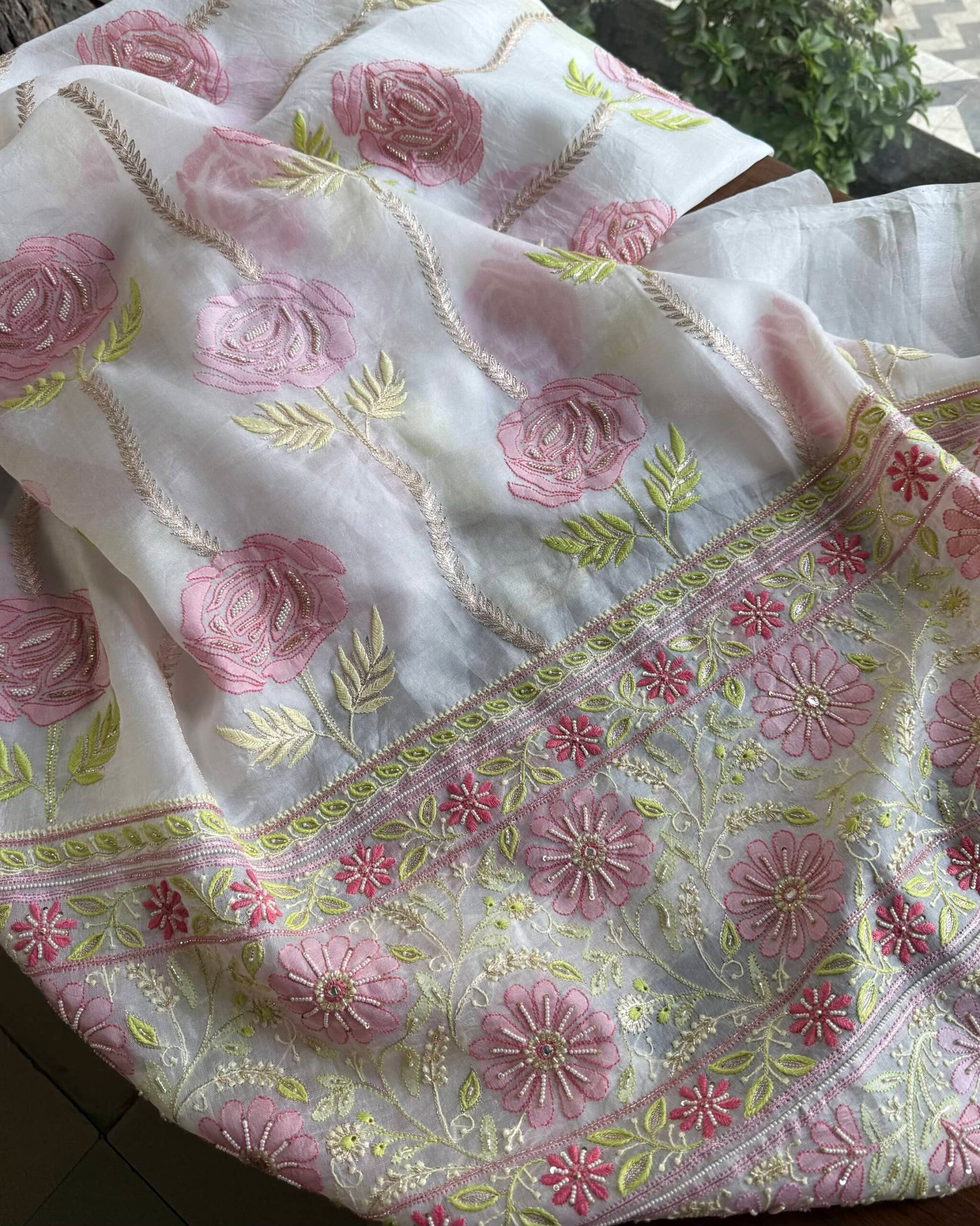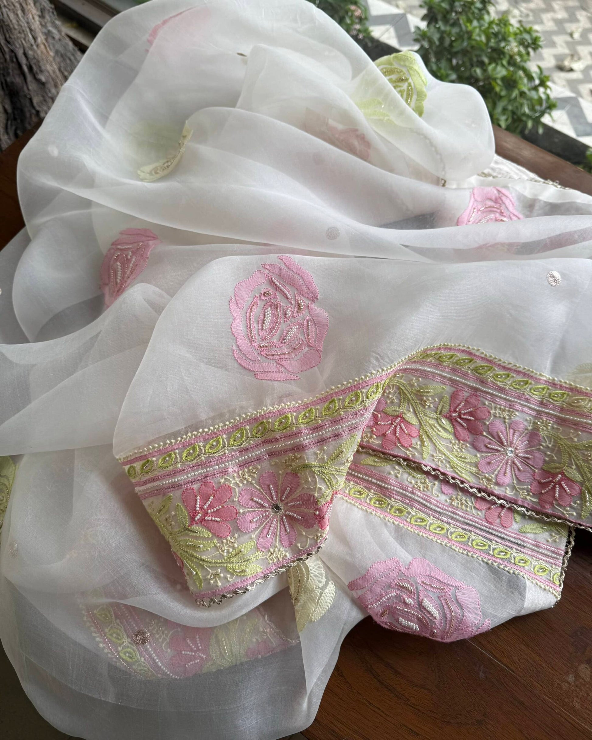 Organza's in our pastel shades are a dreamy affair done with intricate dual tone Chikankari embroideries and add on with our signature SAMAN's Ari and beads work.