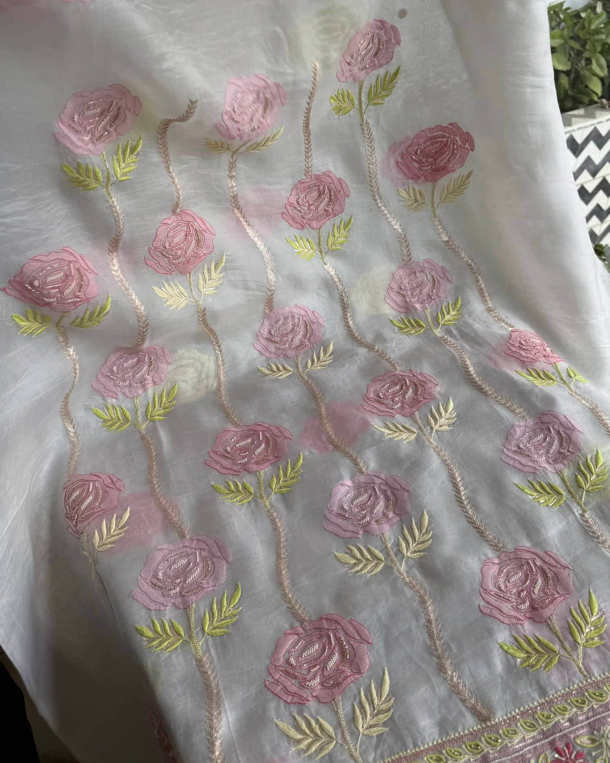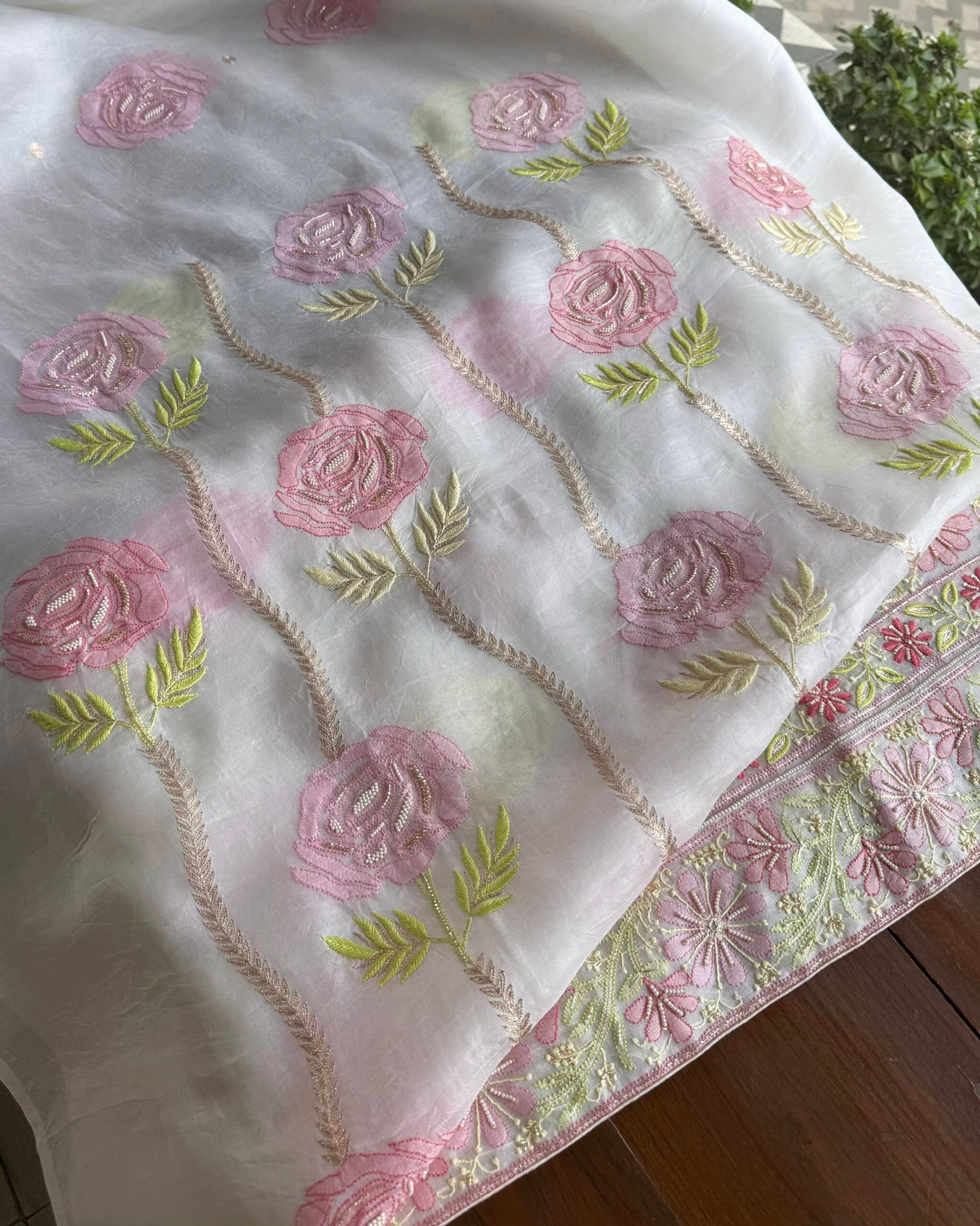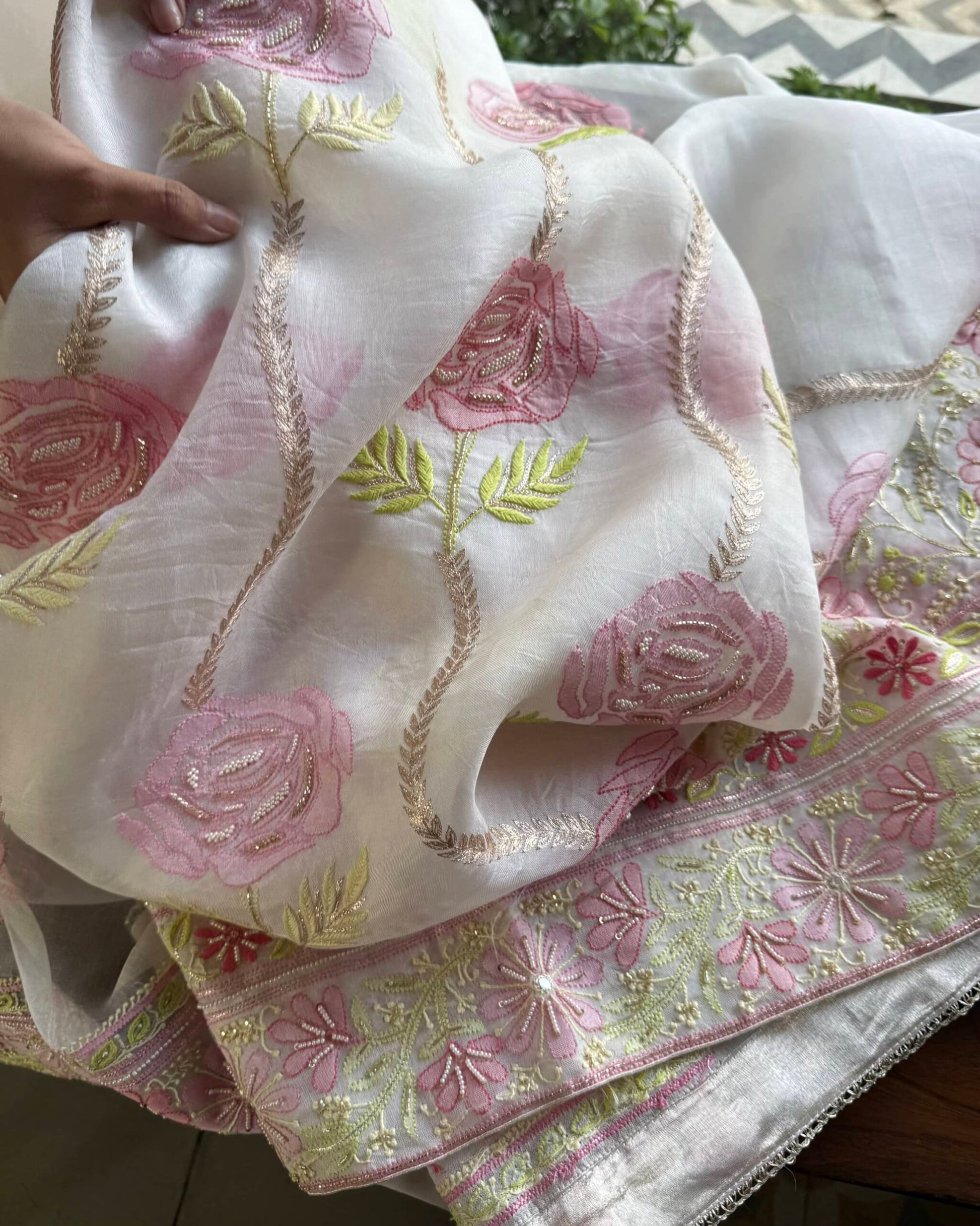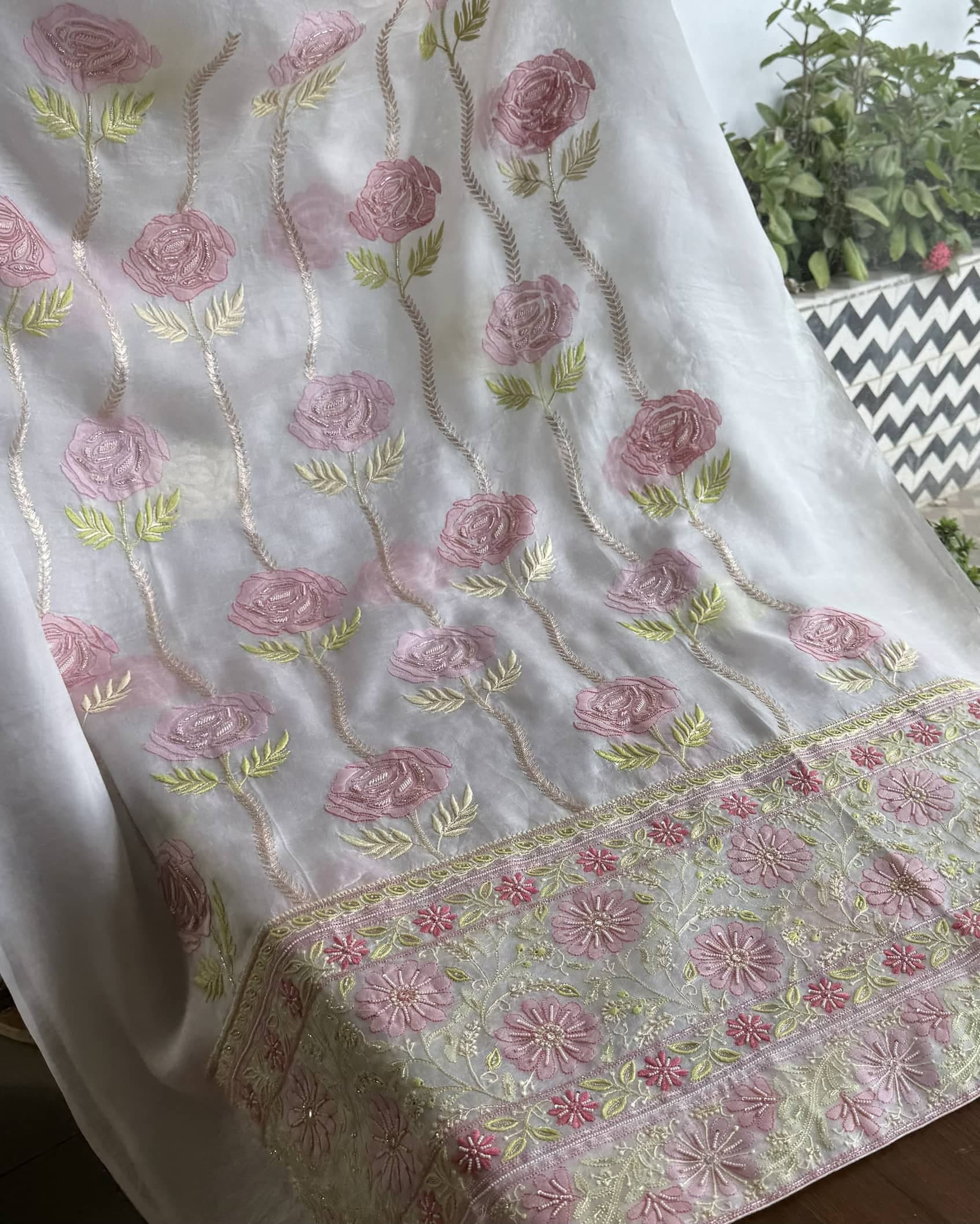 Organza's in our pastel shades are a dreamy affair done with intricate dual tone Chikankari embroideries and add on with our signature SAMAN's Ari and beads work.