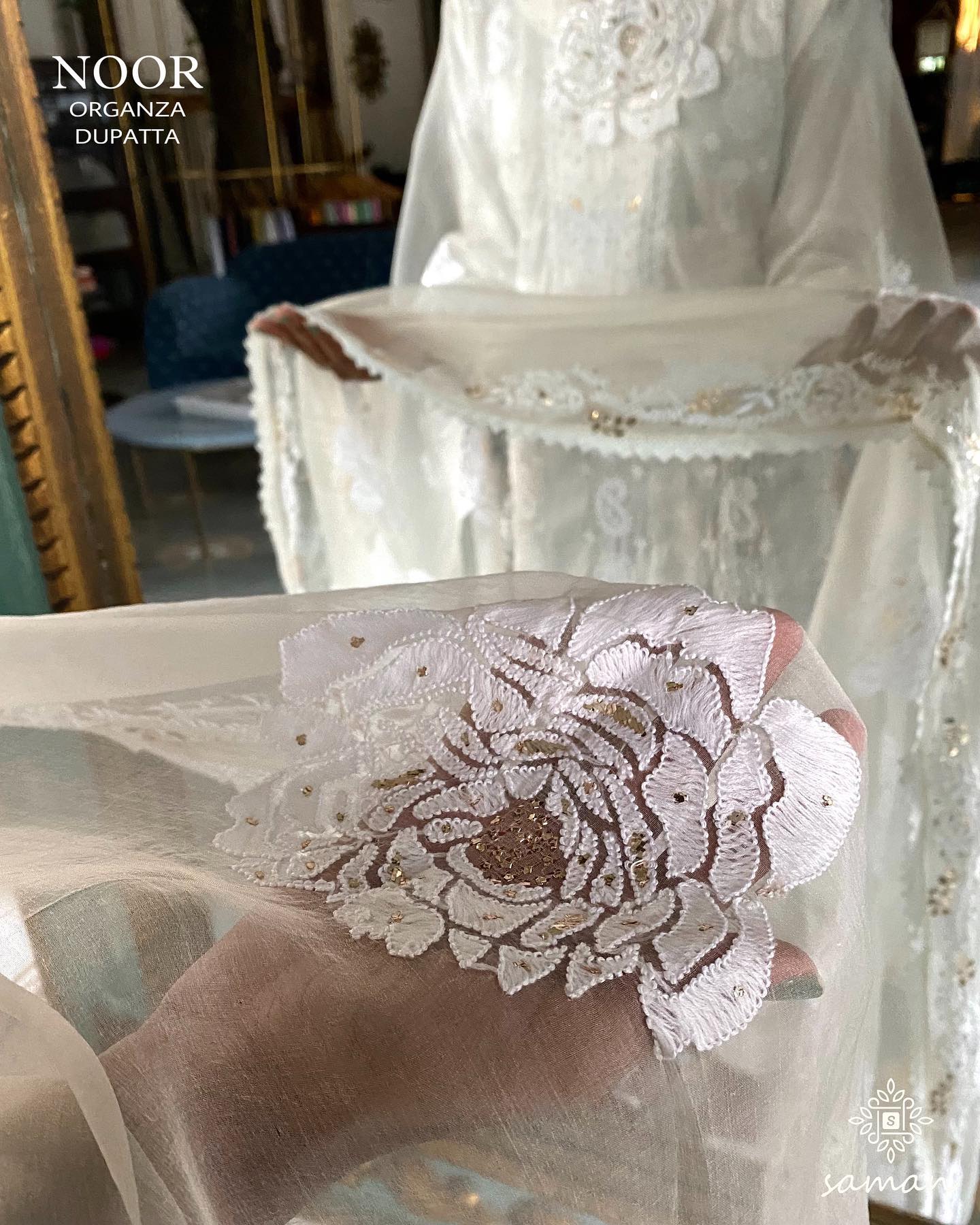Our Signature Rose and circular coral motifs organza silk dupattas finished with fine beading lace with subtle Mukaish work.