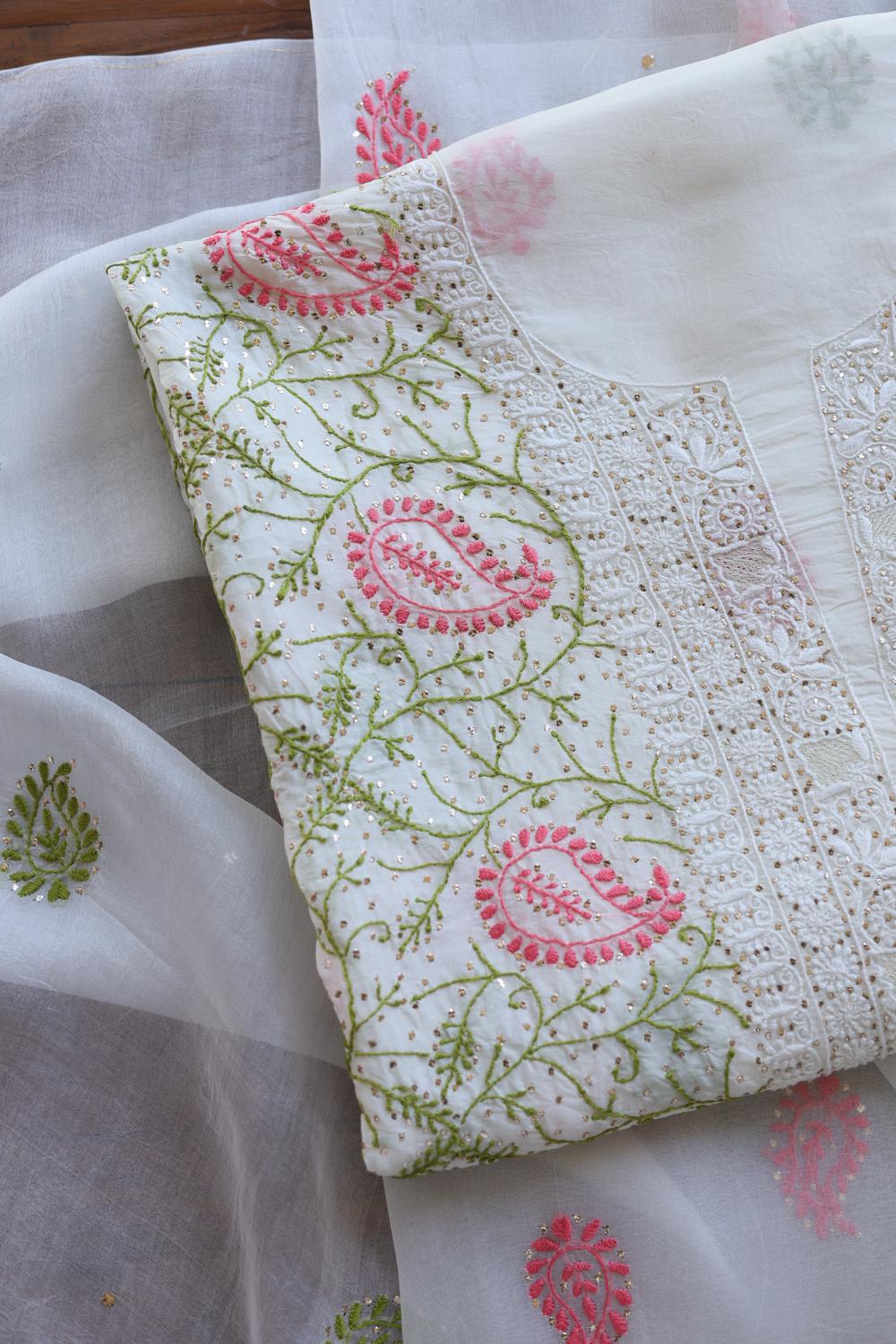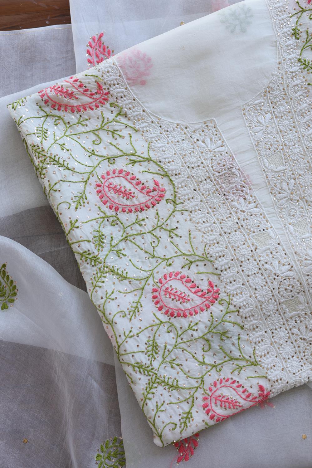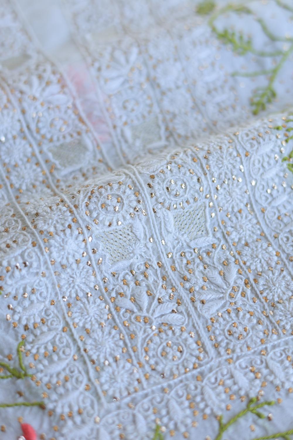 White Noor Organza Silk Chikankari With Mukaish Kamdani Unstitched Fabric