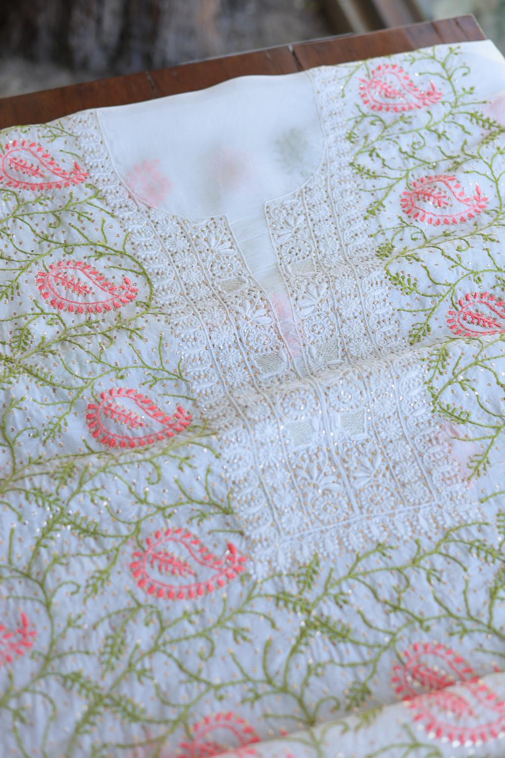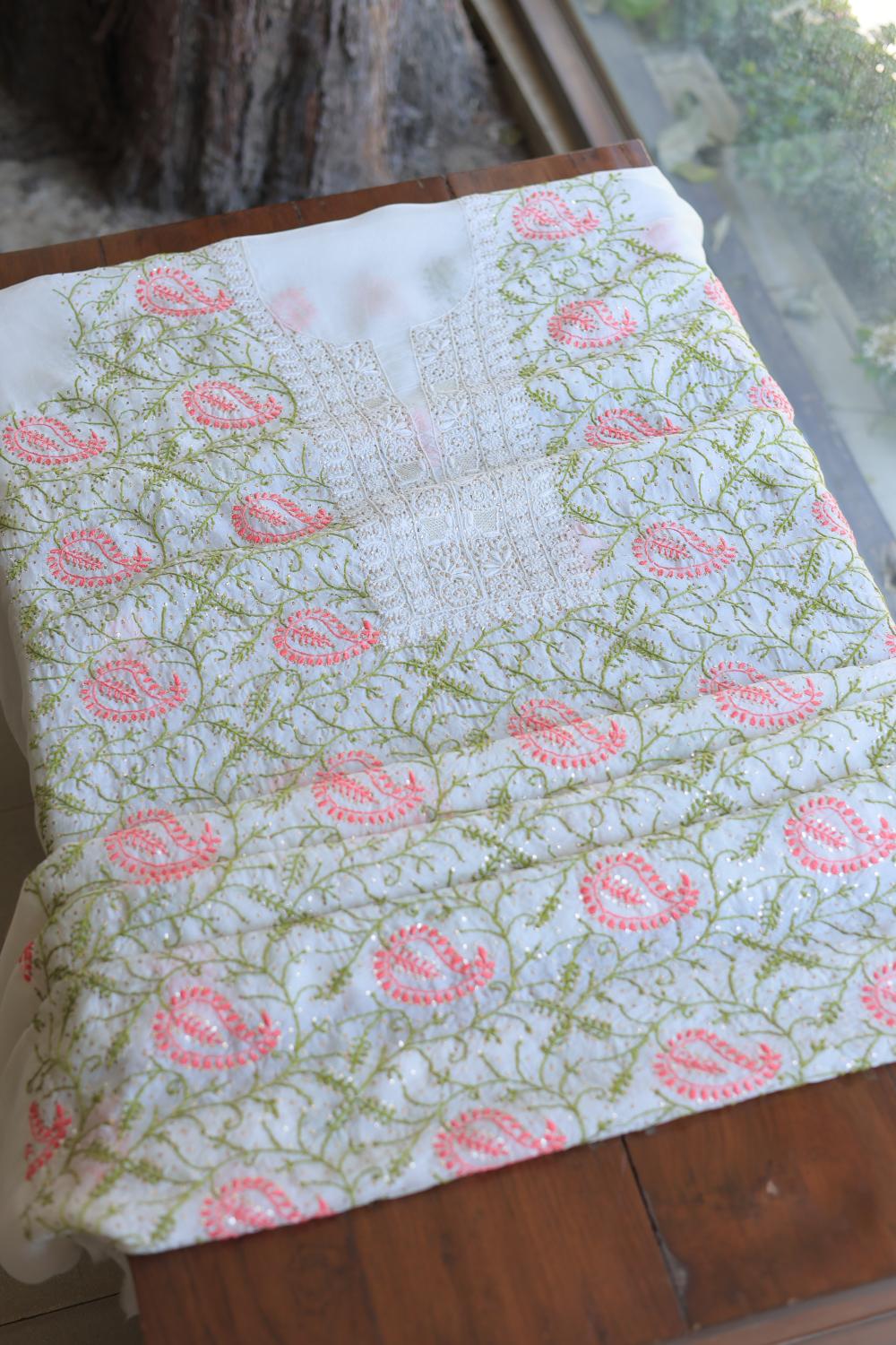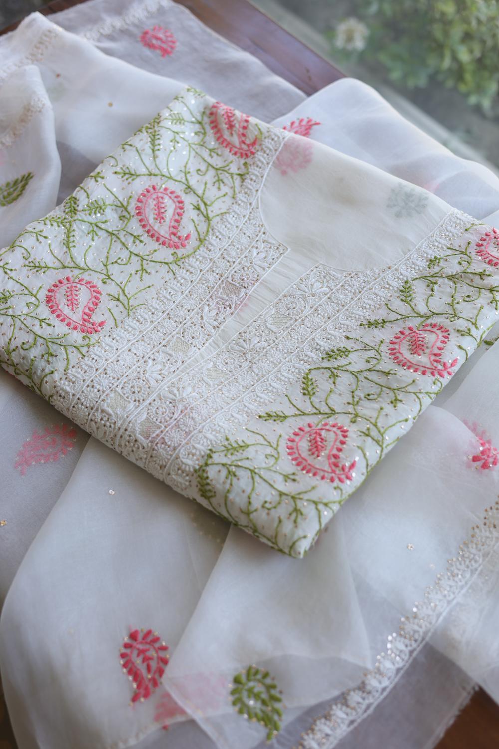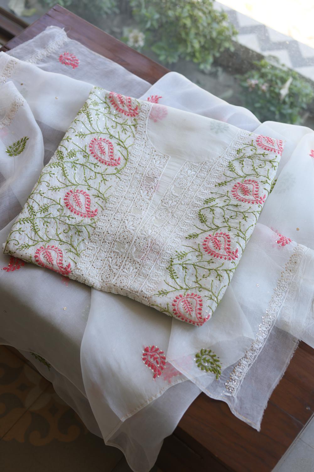 White Noor Organza Silk Chikankari With Mukaish Kamdani Unstitched Fabric