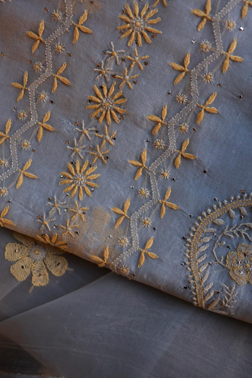 Blue Shade Organza Silk Chikankari Unstitched Fabric