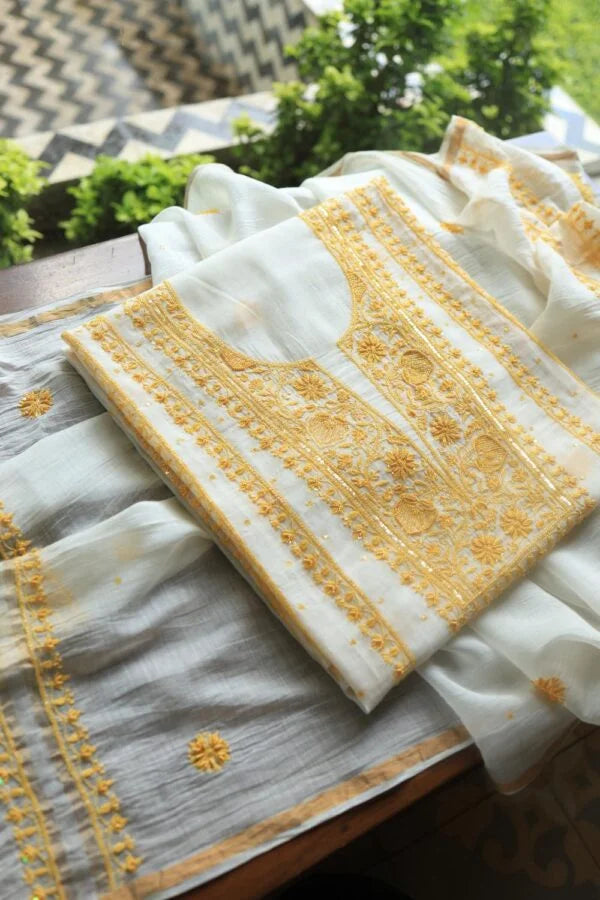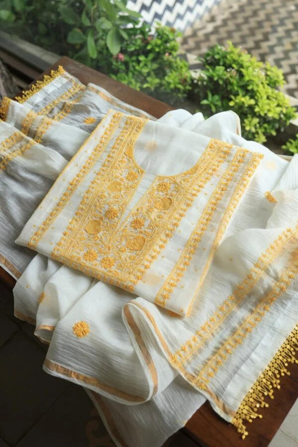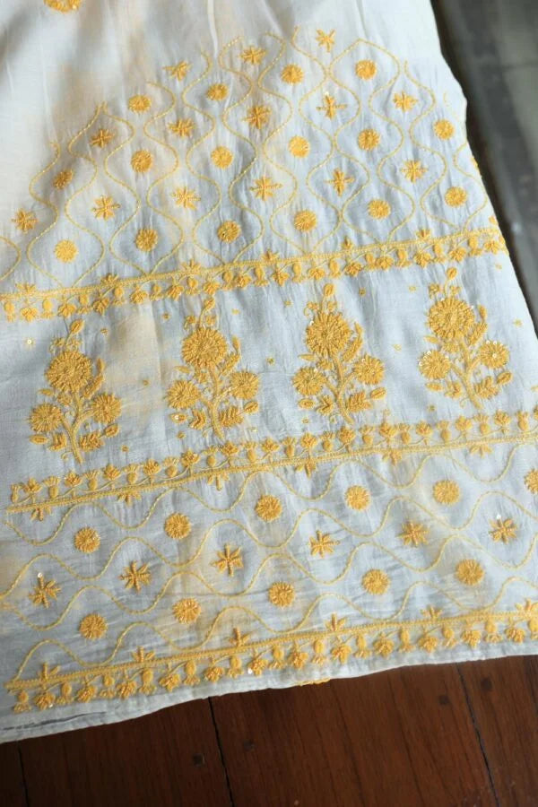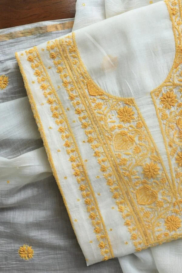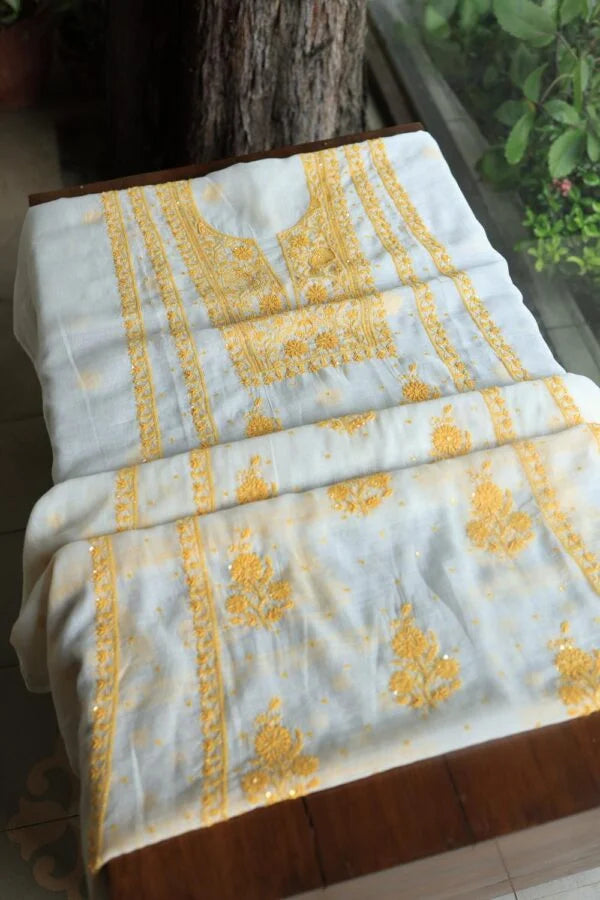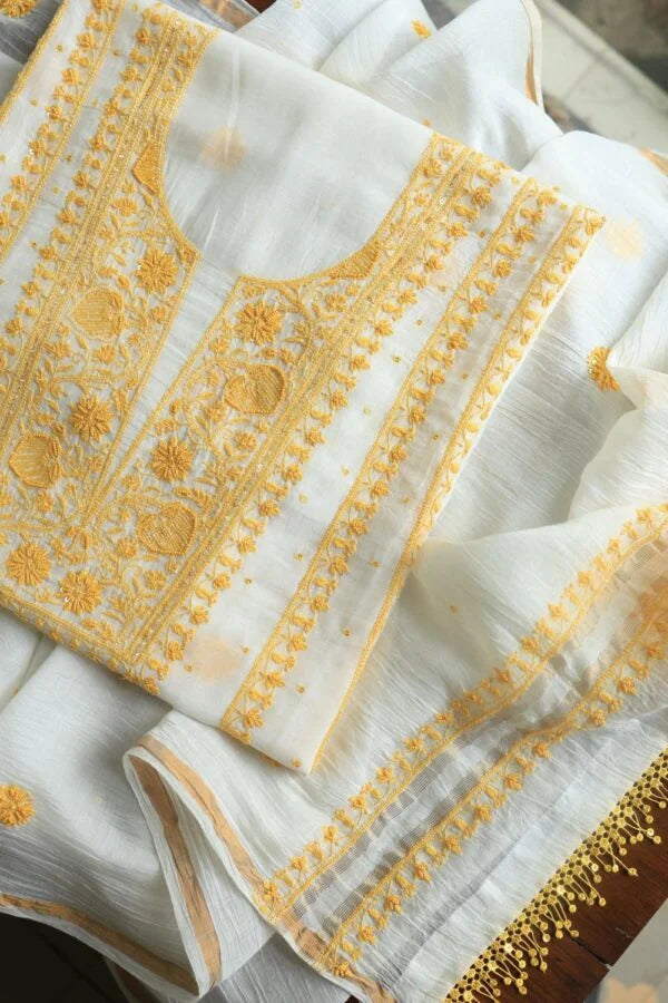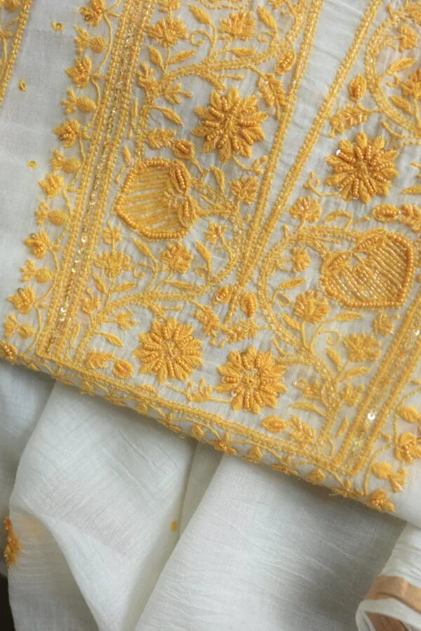 White & Yellow Mal Chanderi Silk Chikankari With Sequins Unstitched Kurta Dupatta Set