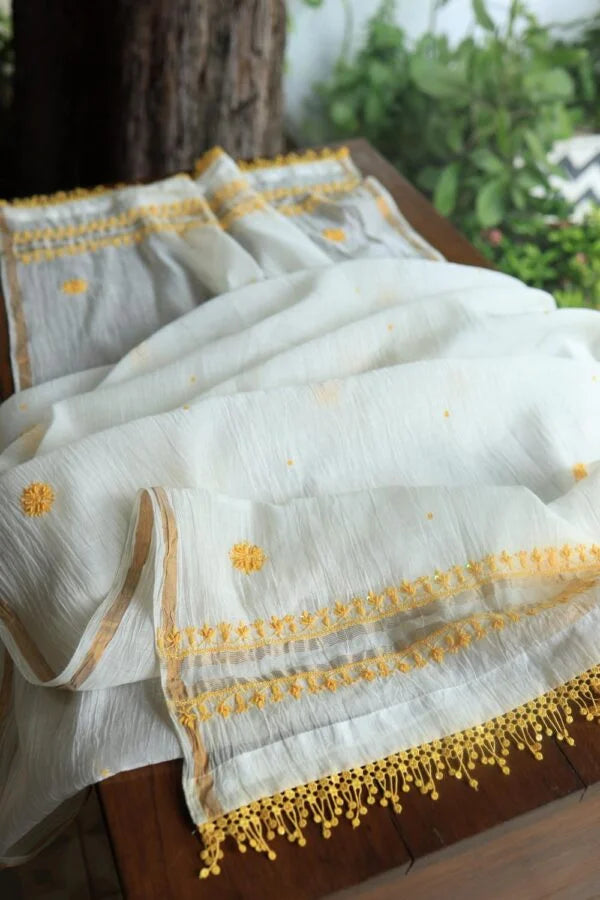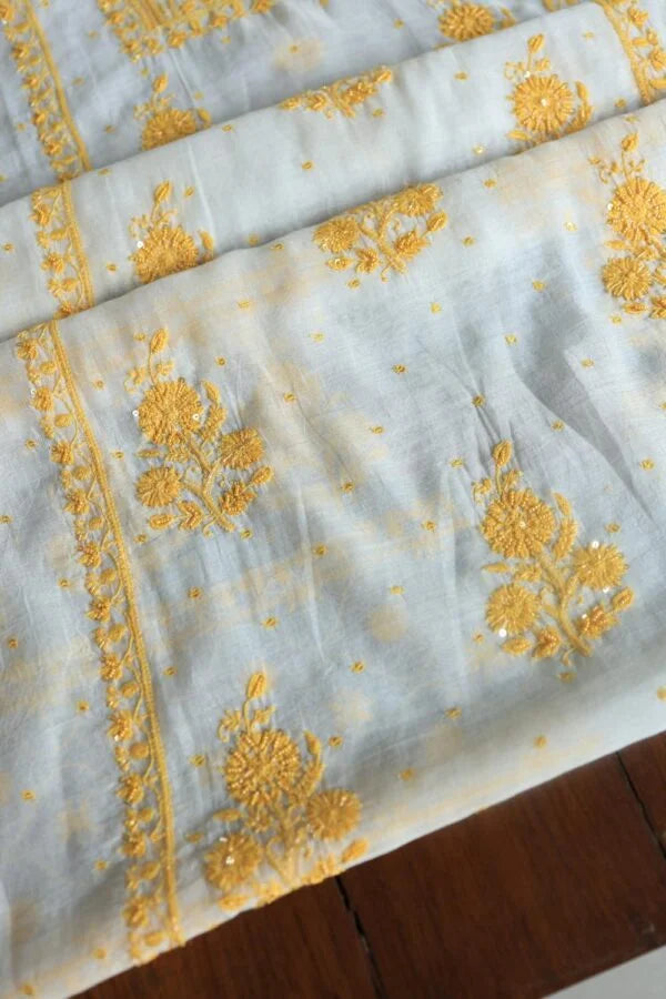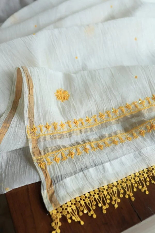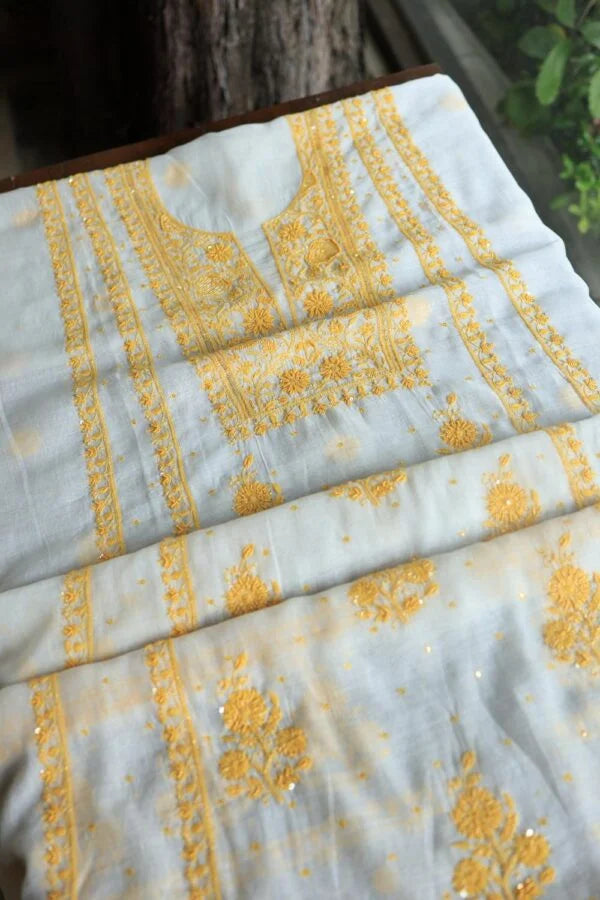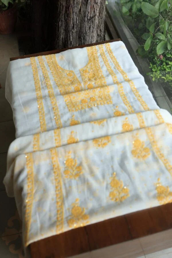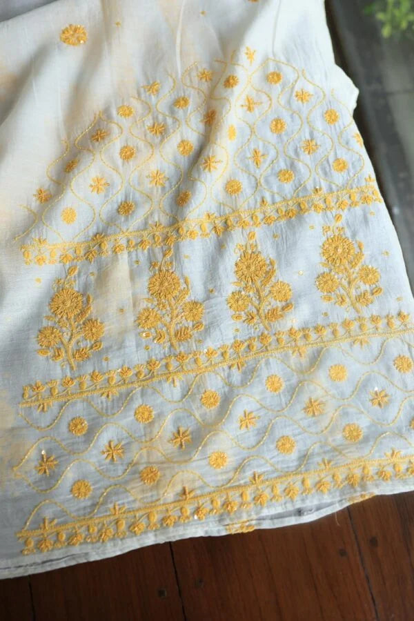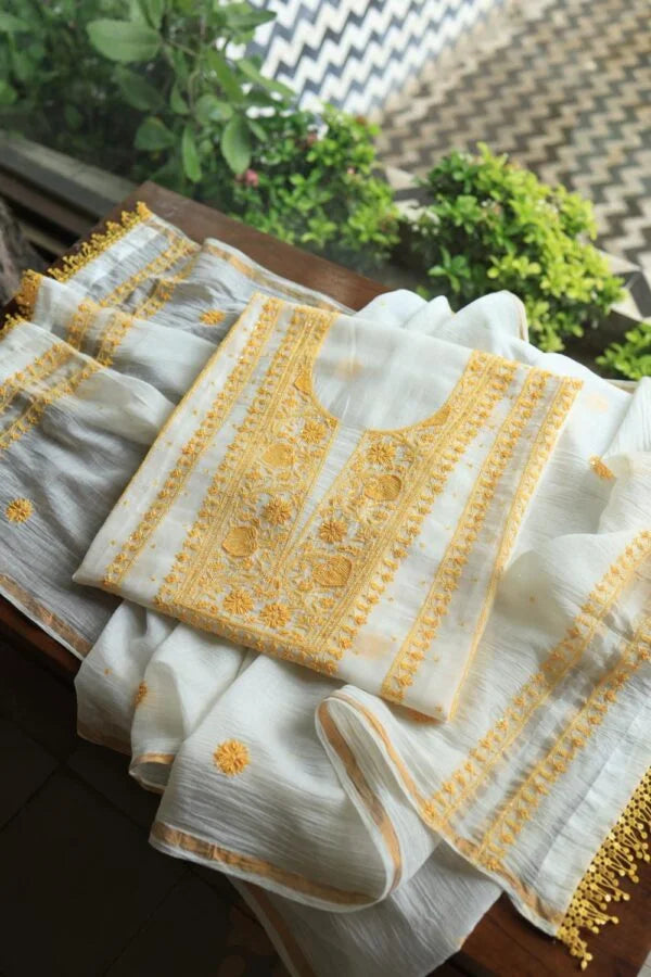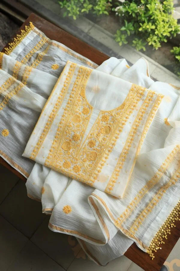 White & Yellow Mal Chanderi Silk Chikankari With Sequins Unstitched Kurta Dupatta Set