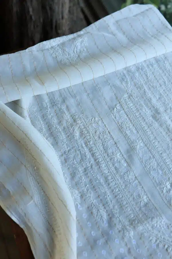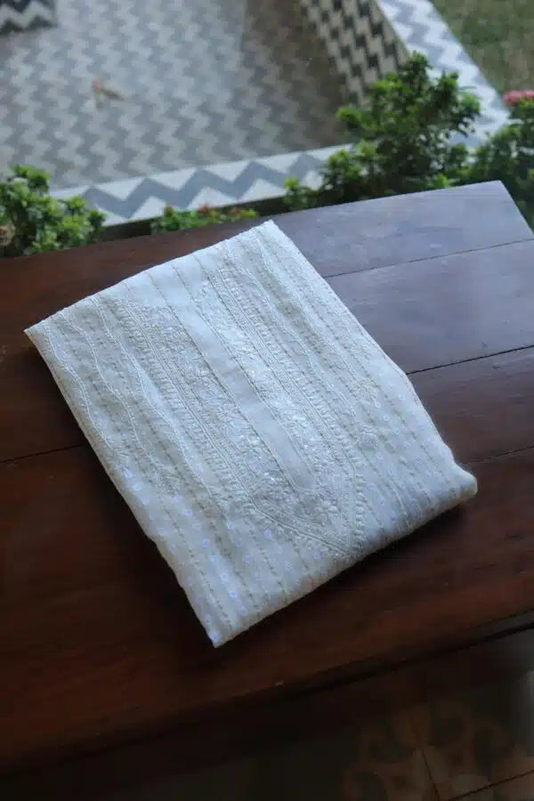 White Zari Chanderi Unisex Chikankari Men’s Kurta Fabric