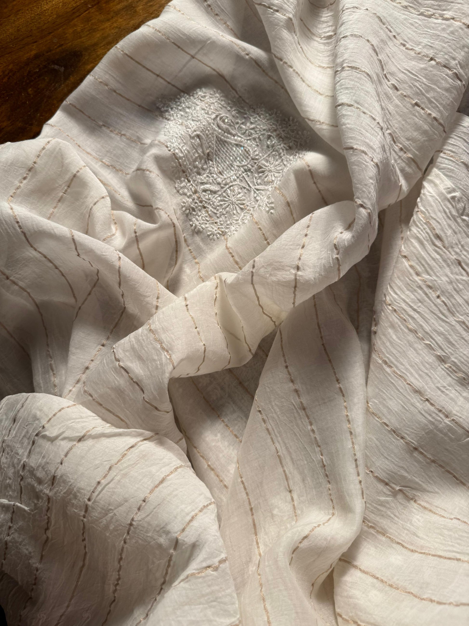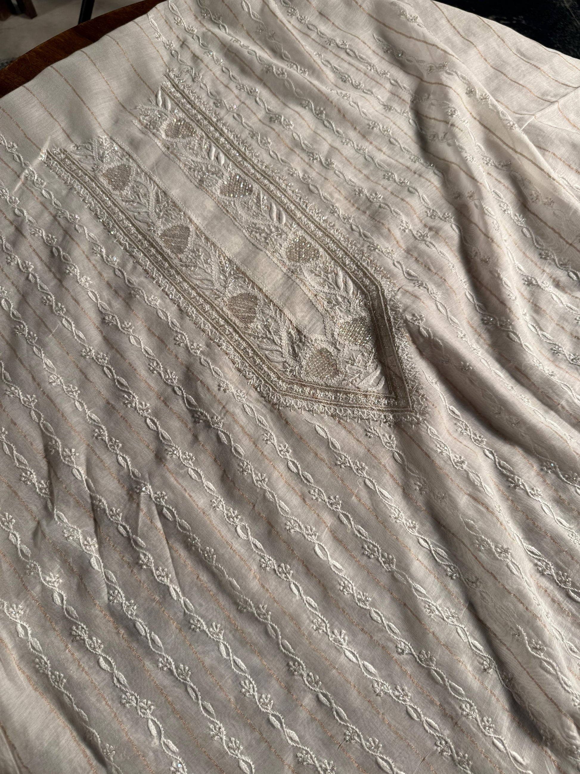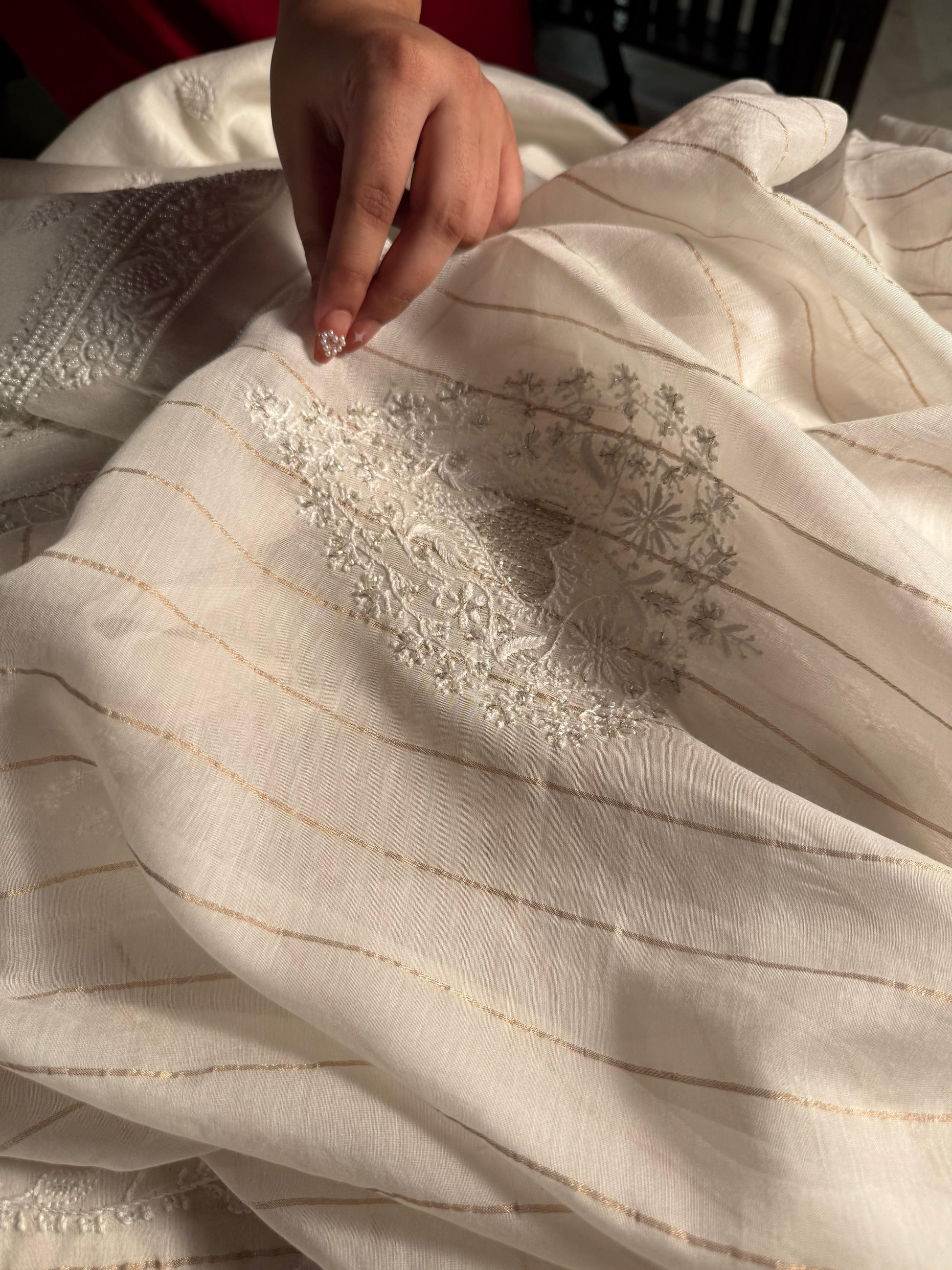 Each piece is crafted with intricate hand-embroidered Chikankari, featuring different traditional embellishments: