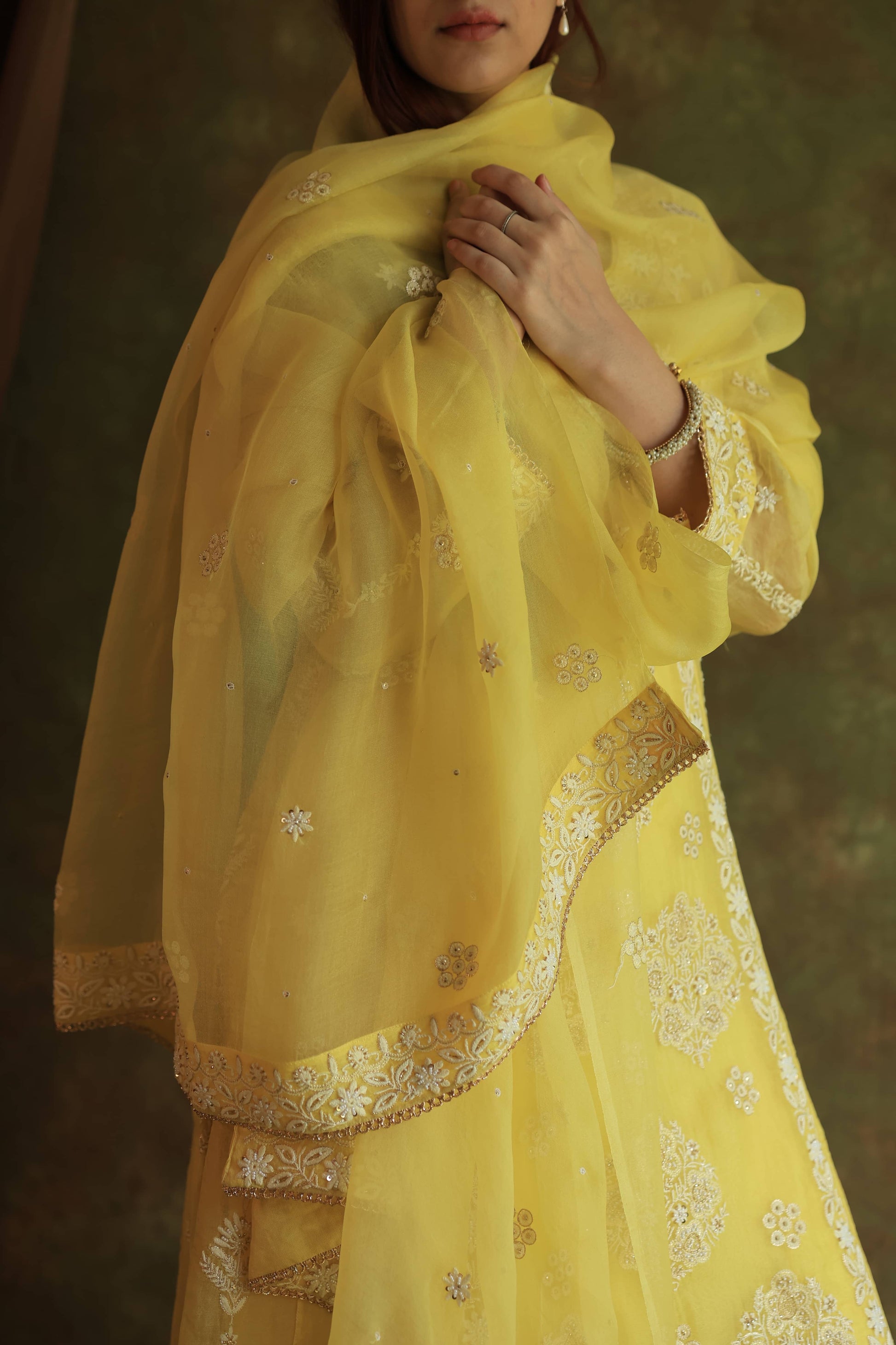 Yellow Noor Organza Chikankari Anarkali With Dupatta