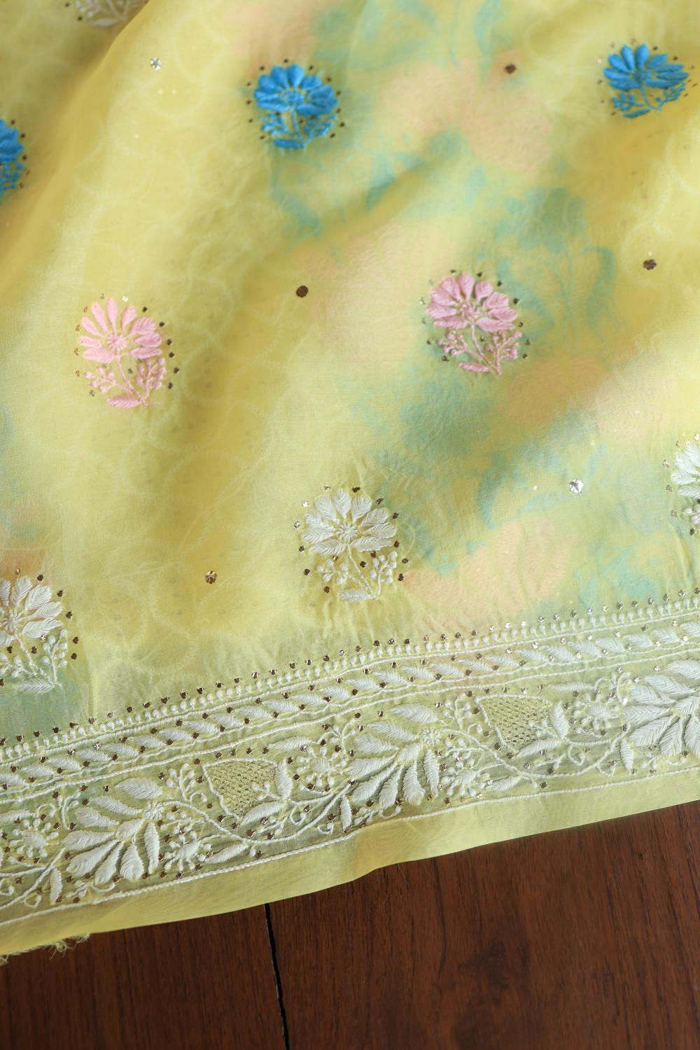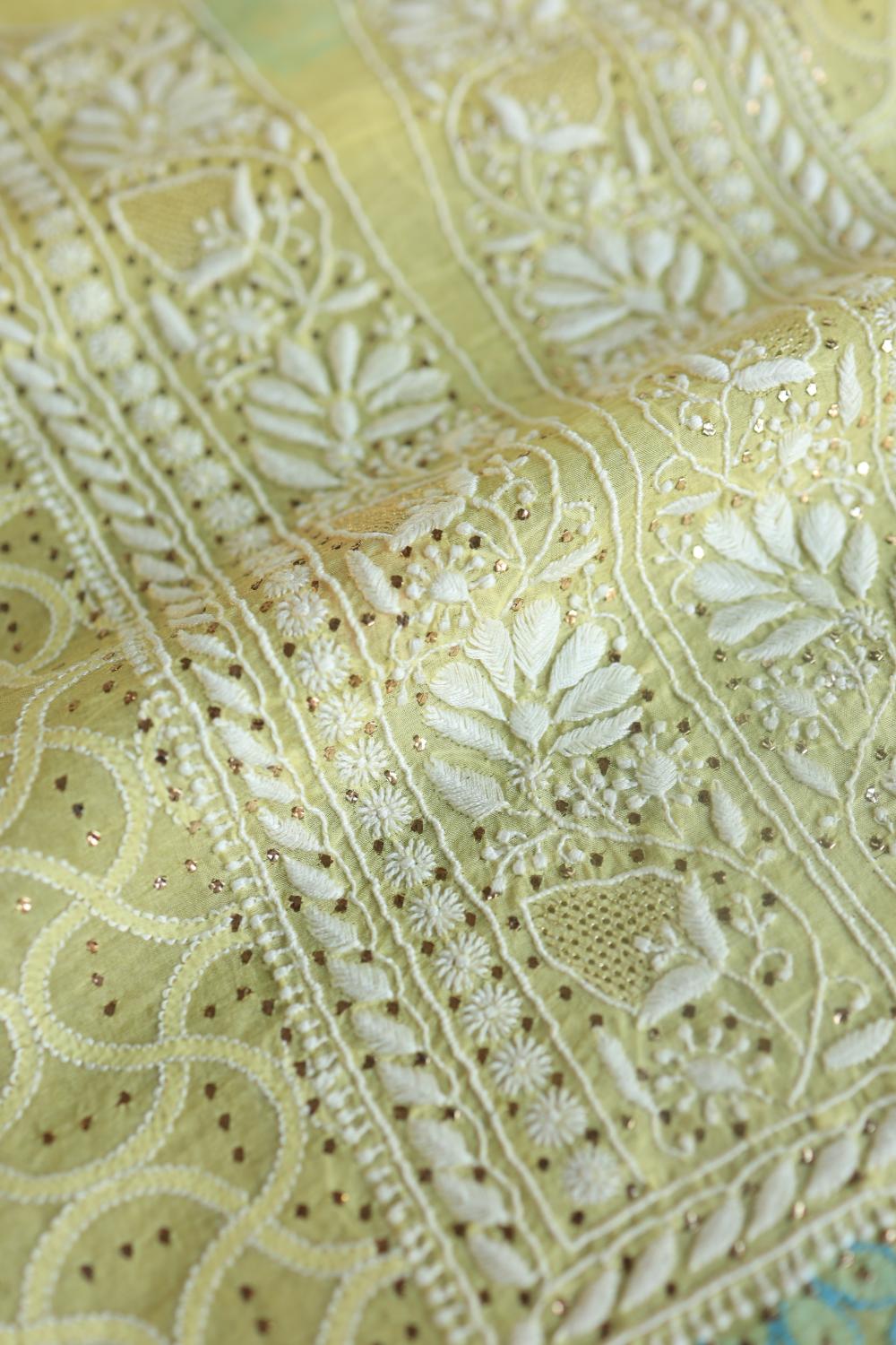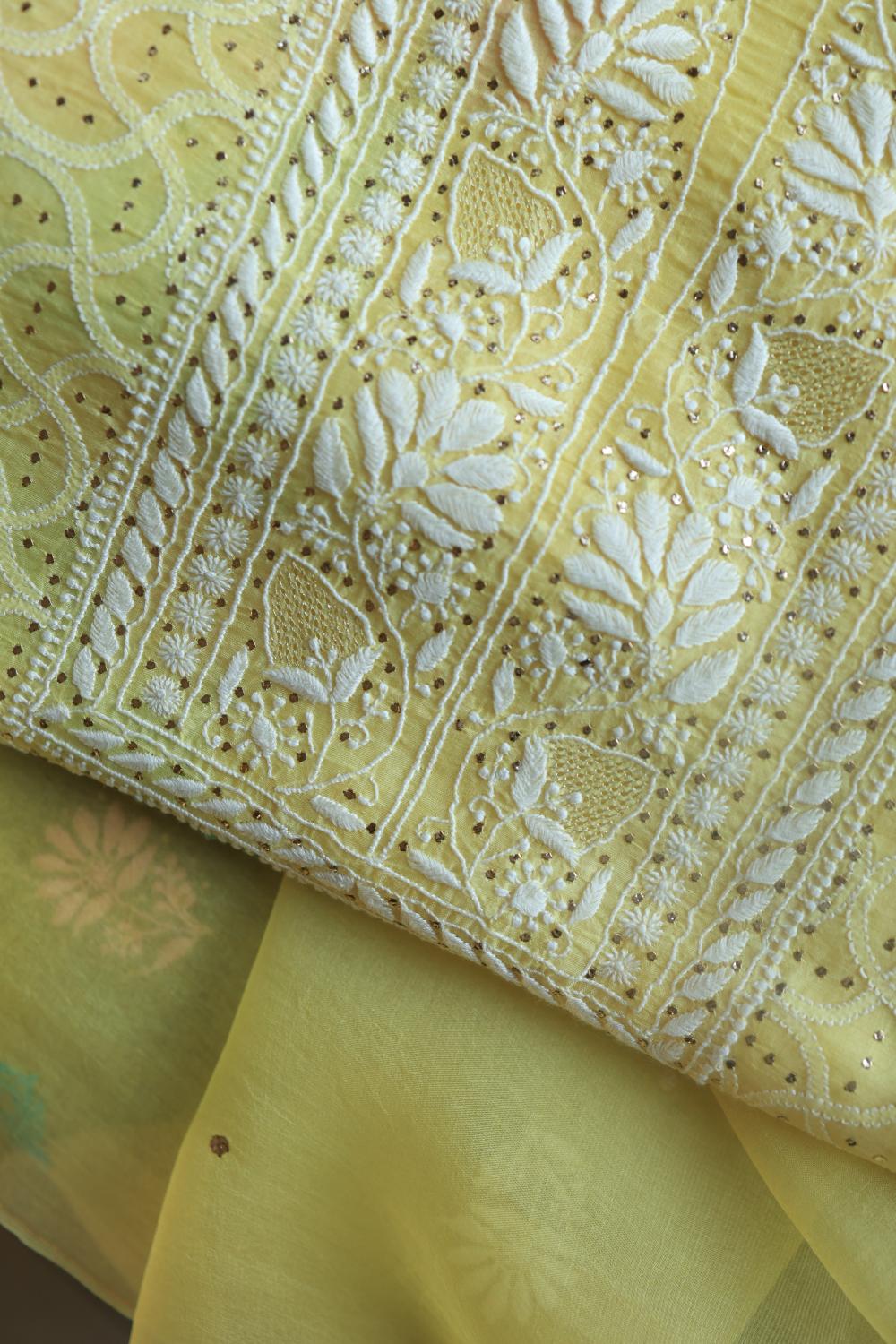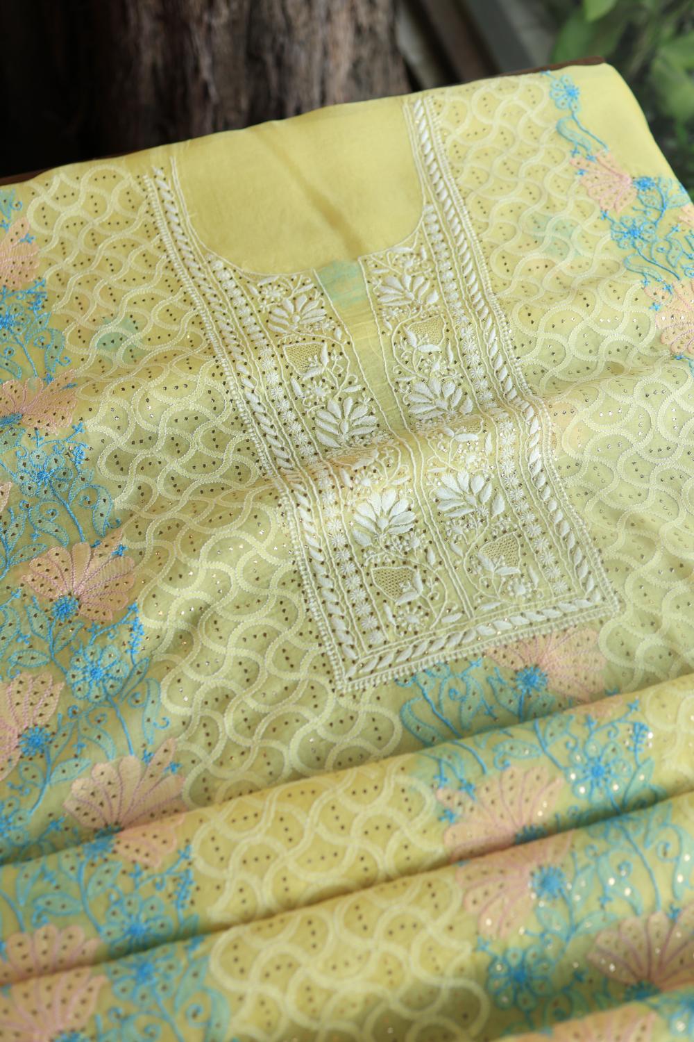 Yellow Noor Organza Silk Chikankari With Mukaish Kamdani Fabric