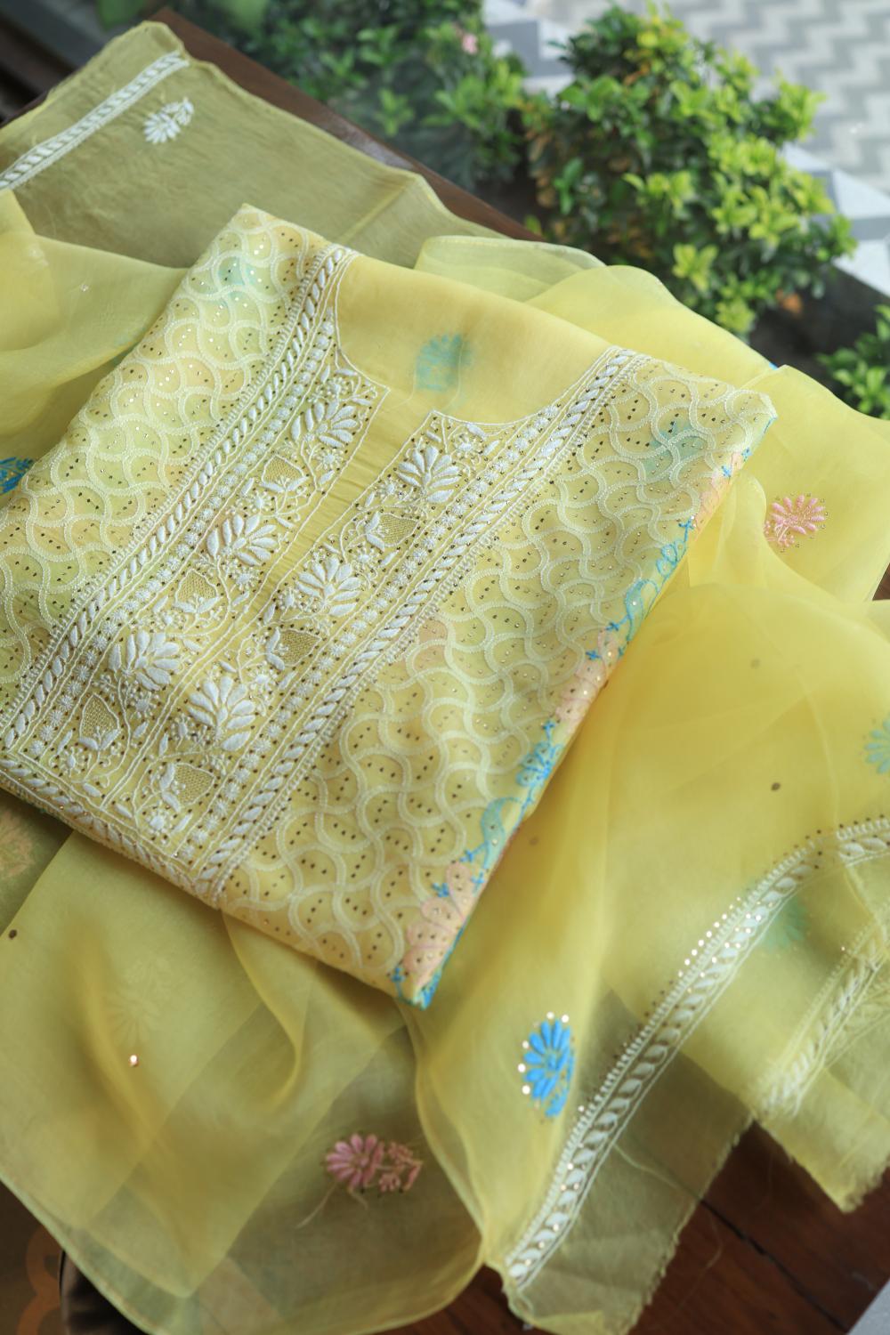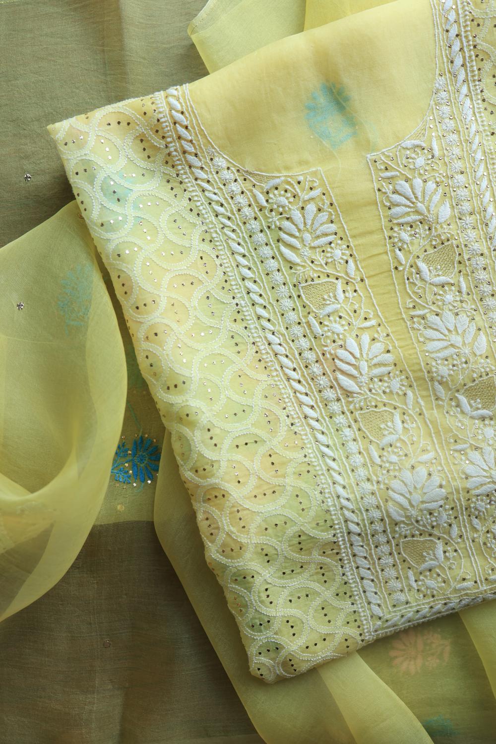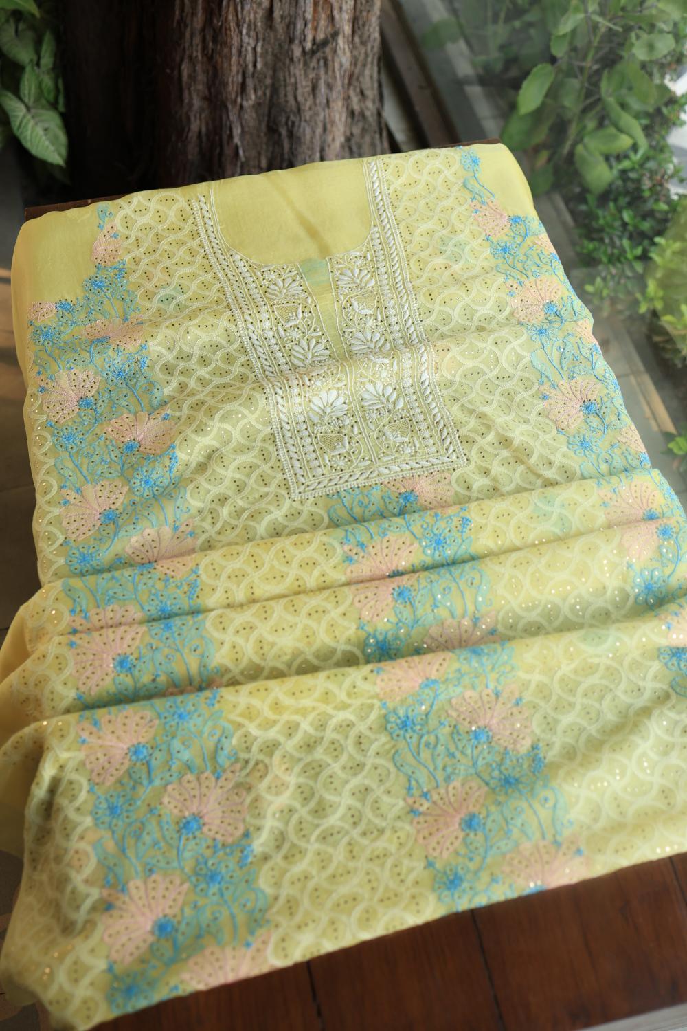 Yellow Noor Organza Silk Chikankari With Mukaish Kamdani Fabric