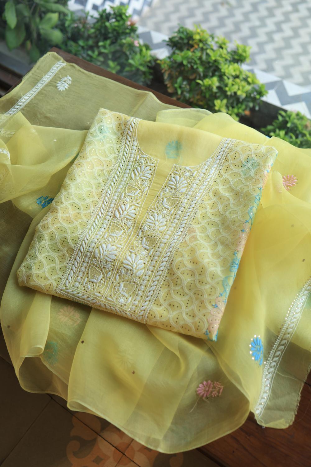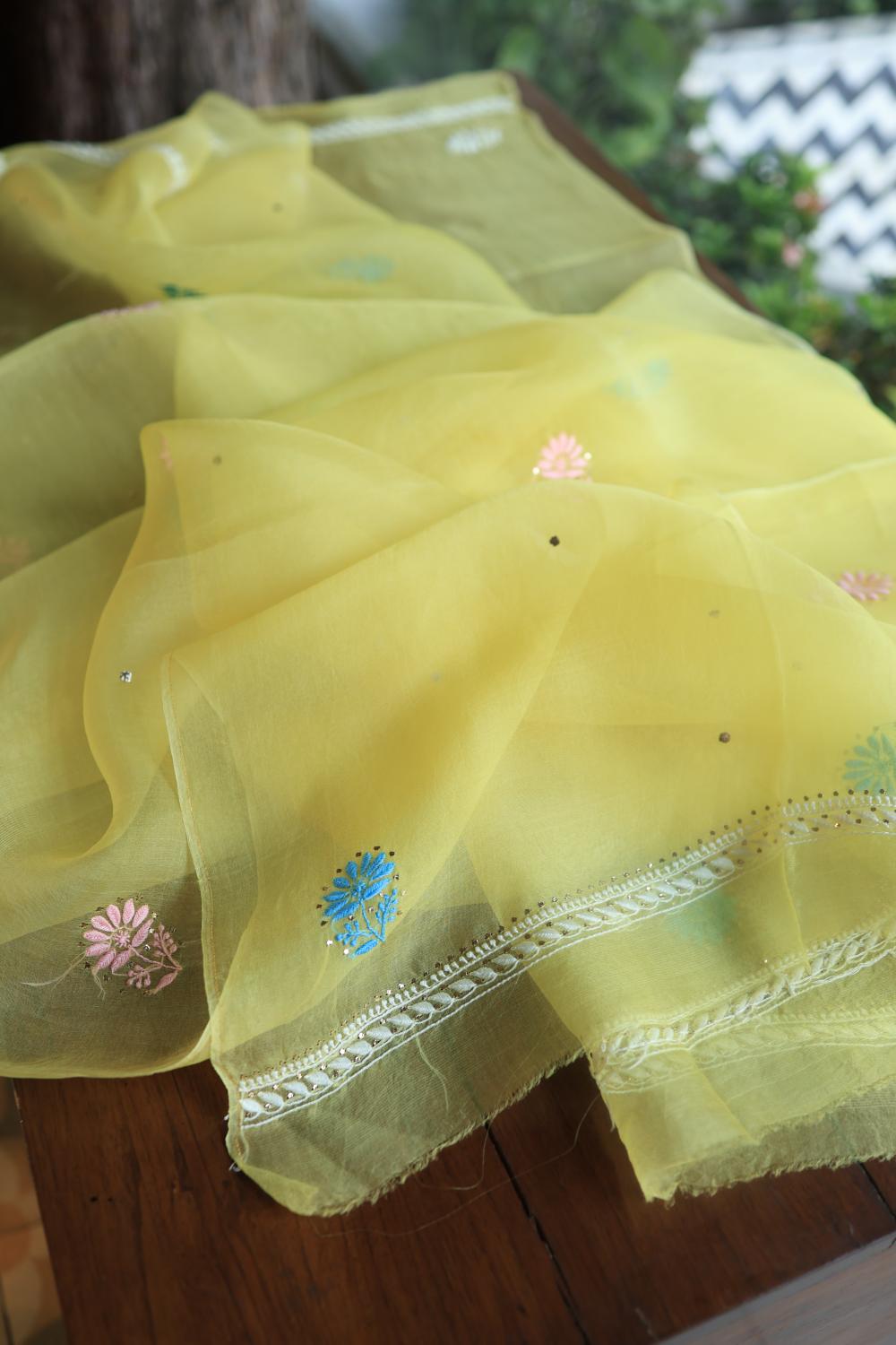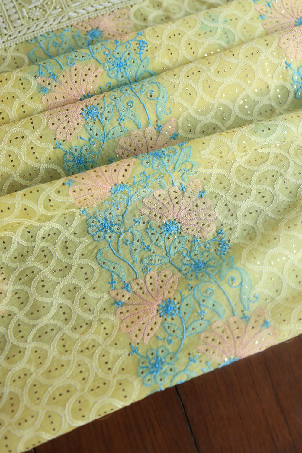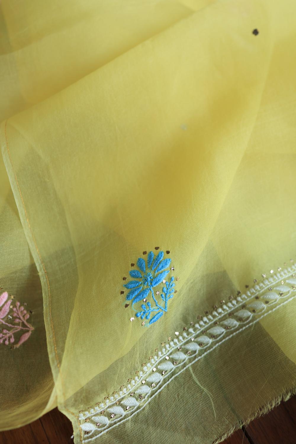 Yellow Noor Organza Silk Chikankari With Mukaish Kamdani Fabric