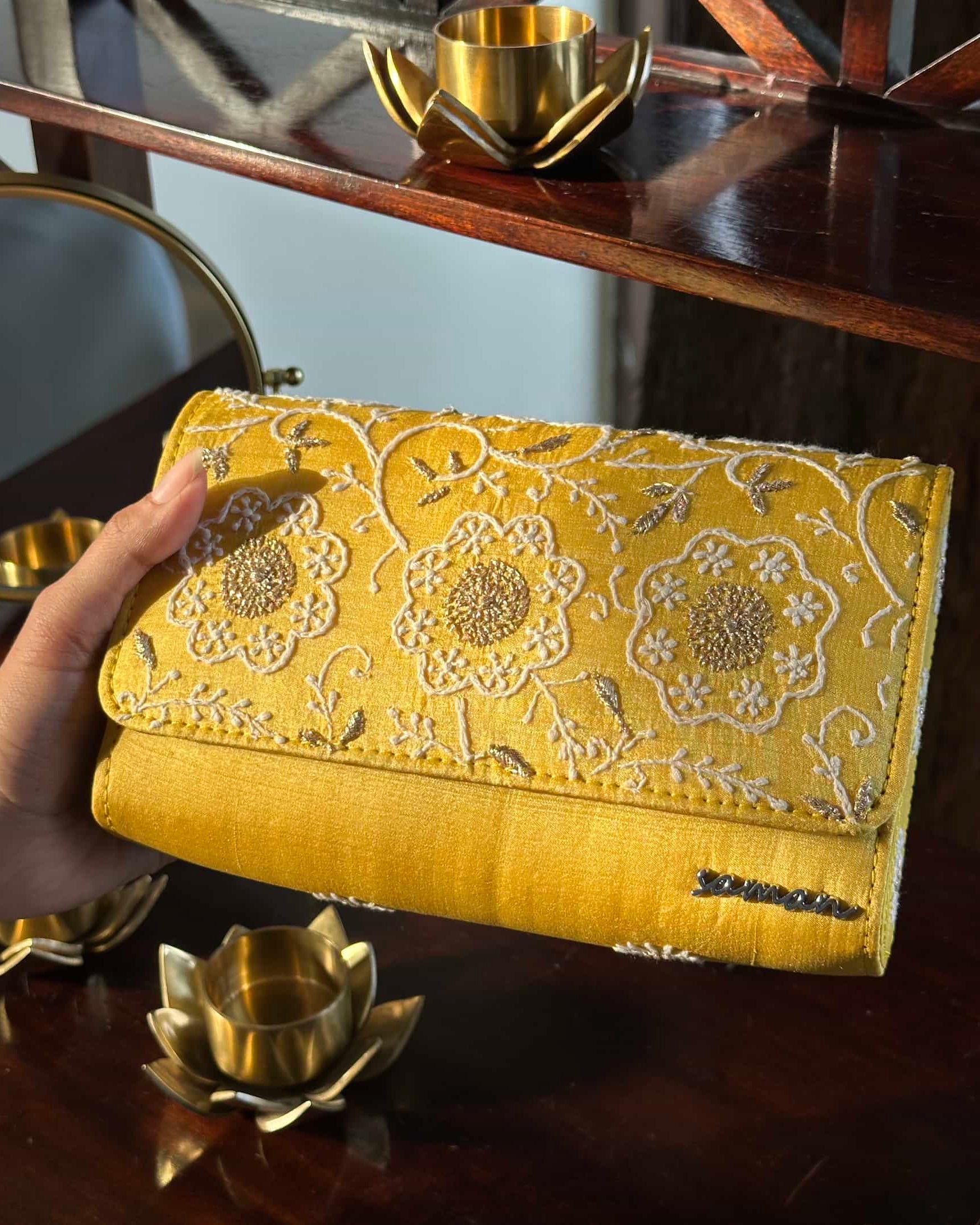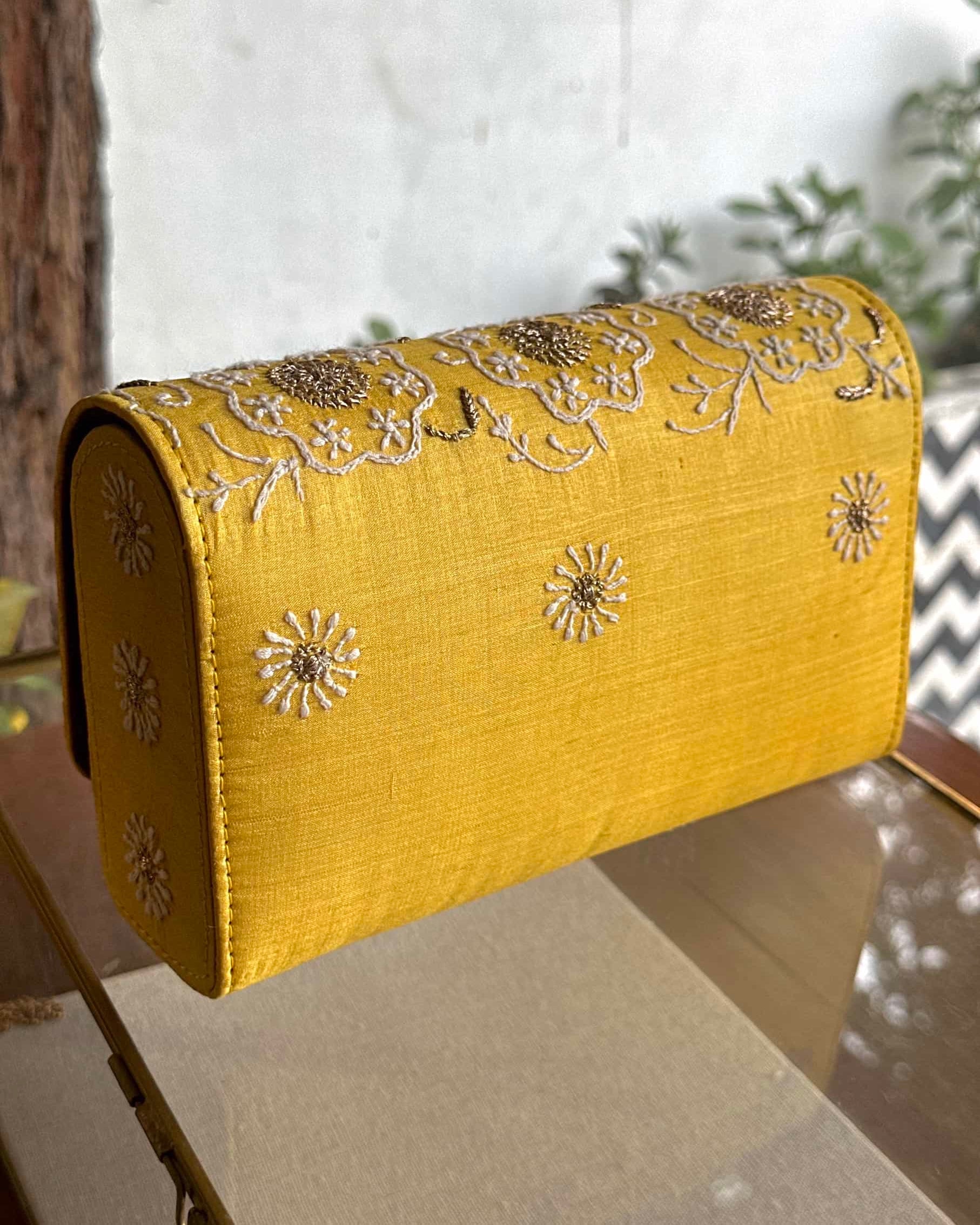 Sling cross body bag with our intricate Chikankari and aari work on popping colourful shades, comes with a metal sling chain and perfect space to keep all essentials in one place.