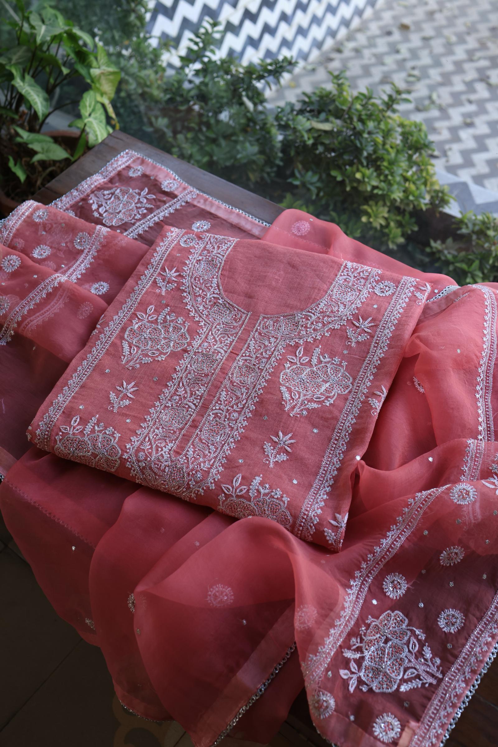 Tulip Pink Shade Silver Tissue Silk Chikankari Unstitched Fabric