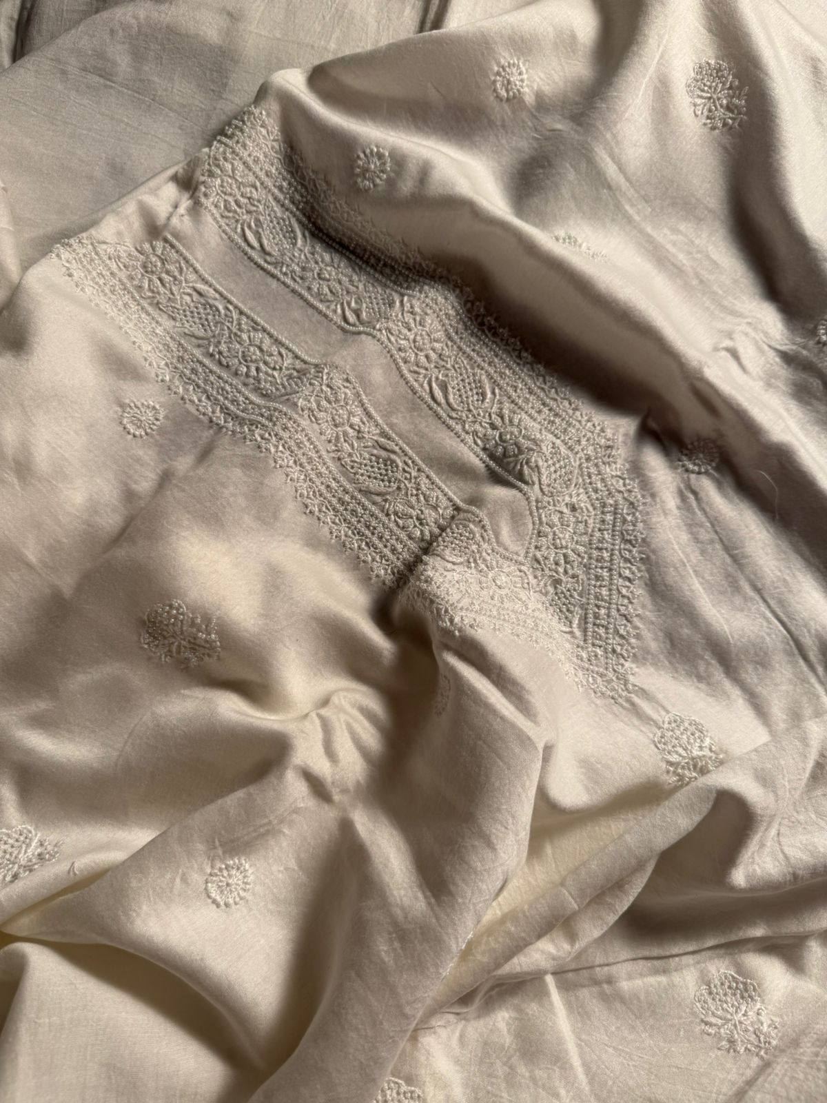 Each piece is crafted with intricate hand-embroidered Chikankari, featuring different traditional embellishments: