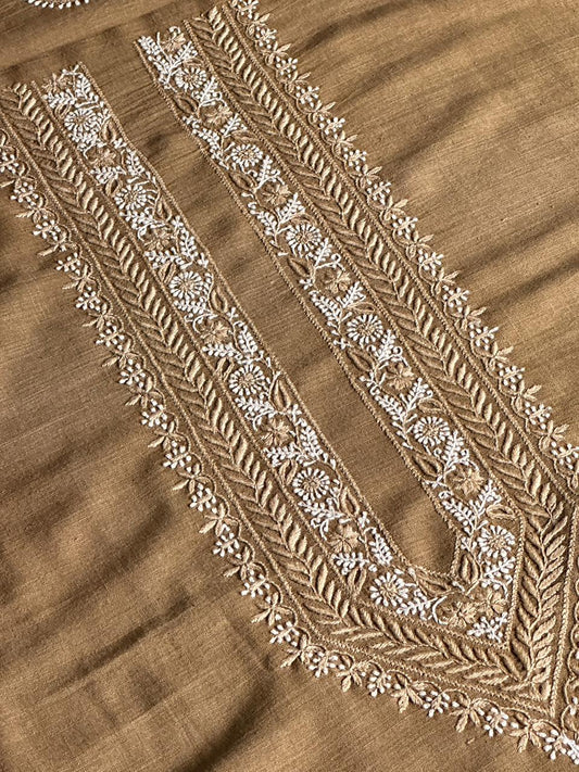 Dark Beige Shade Paper Tussar Resham Chikankari Unstitched Kurta Dupatta Set