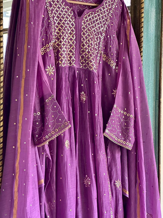 Deep Purple Shade Mukaish Mul Chanderi Silk Dress